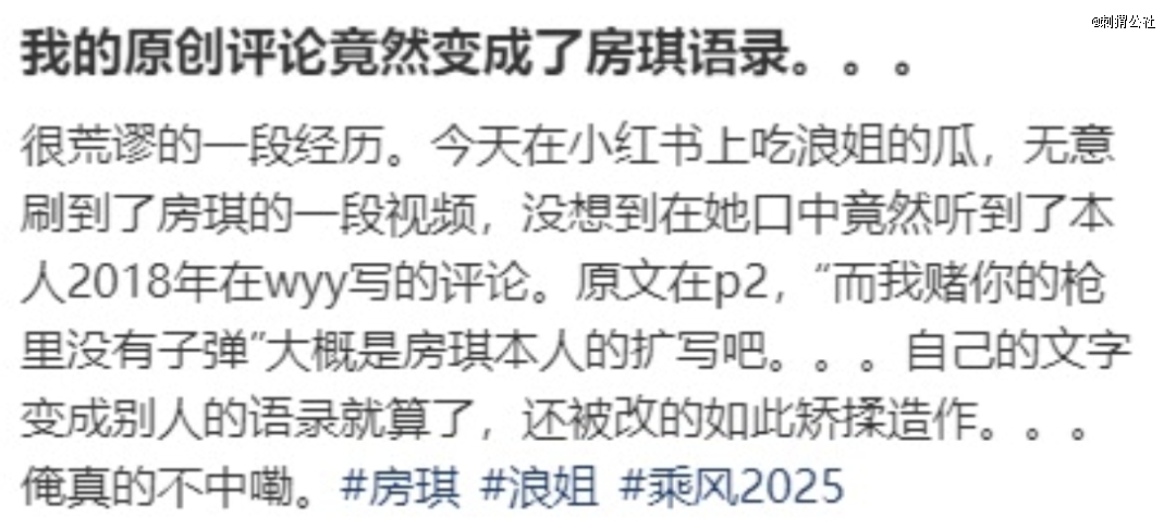 随着争议的发酵,房琪的“才女”人设也受到影响,许多网友扒出此前的各种金句都并非她原创,而是拼凑得来。例如“爱是当你望向我时,所有星光都穿透我的心脏,而我赌你的枪里没有子弹”,前半部分来自QQ空间,后半部分则来源于影视作品。甚至她赖以成名的“他强任他强,清风拂山岗”都被质疑来源于金庸《倚天屠龙记》的九阳神功口诀。