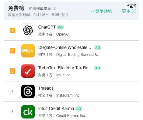 明明上周DHgate在美区App Store里,还是个排在几百名开外的小透明,但根据4月16日的数据,DHgate一跃成为了仅次于ChatGPT的存在。