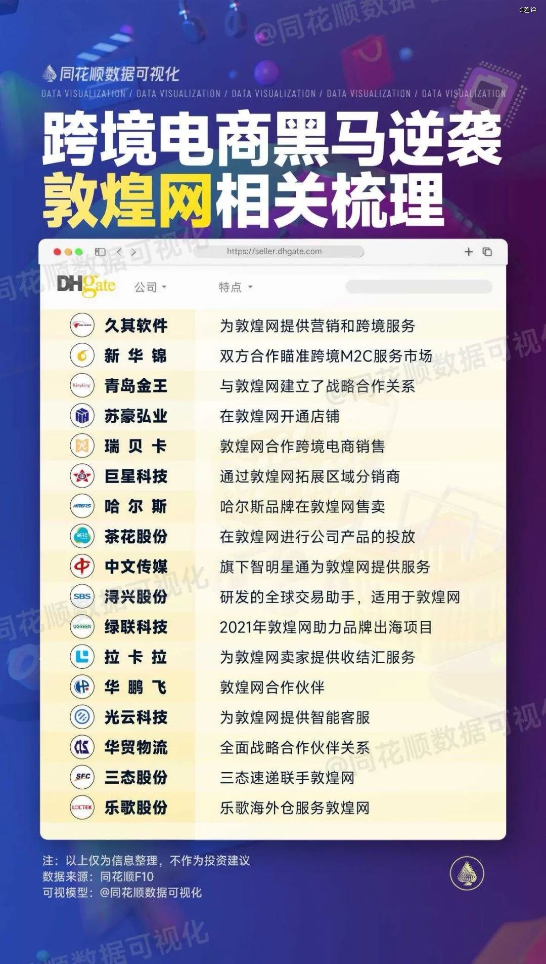 这么说吧,国内已经有机构把跟敦煌网相关的概念股都梳理了出来,跟敦煌网合作的华贸国际物流,今天直接涨停了。