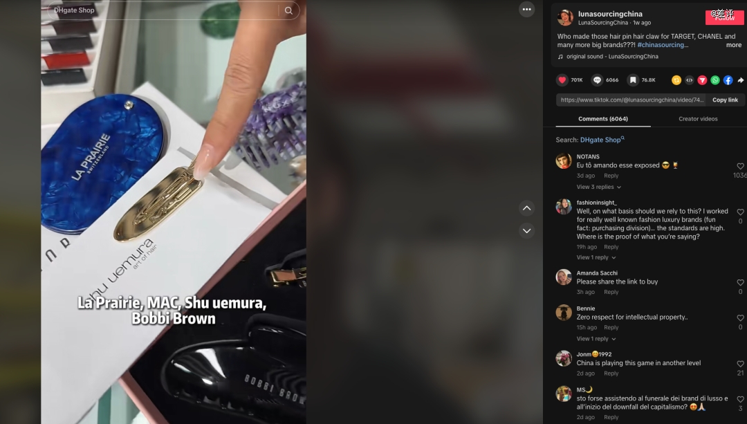 这些视频的关注度有多夸张呢?博主 @lunasourcingchina 一个介绍香奈儿、雅诗兰黛和欧莱雅等品牌供应商的视频,已经有了70多万的点赞。