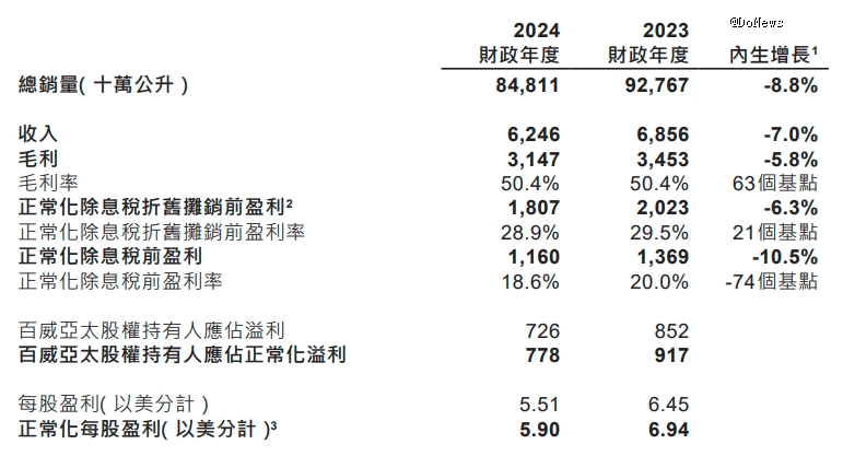 2月底,百威亚太公布了2024年财报。数据显示,2024年百威亚太营收62.46亿美元,同比下滑8.9%;净利润7.5亿美元,同比下滑14.77%;销量方面为84.8亿公升,同比下滑8.8%。