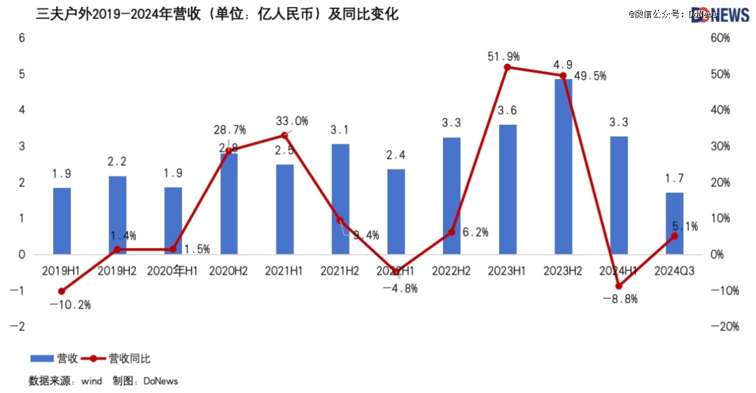可以看到,随着疫情的到来,三者的营收都有着一定的增长。可是,疫情放开后的第 一年(2023年),牧高笛的营收就陷入停滞;放开后的第二年(2024年),三夫户外营收和净利润也开始出现明显的下滑。虽然探路者保持了营收增长,但其财报将业绩的提升归功于芯片业务的大幅增加。
