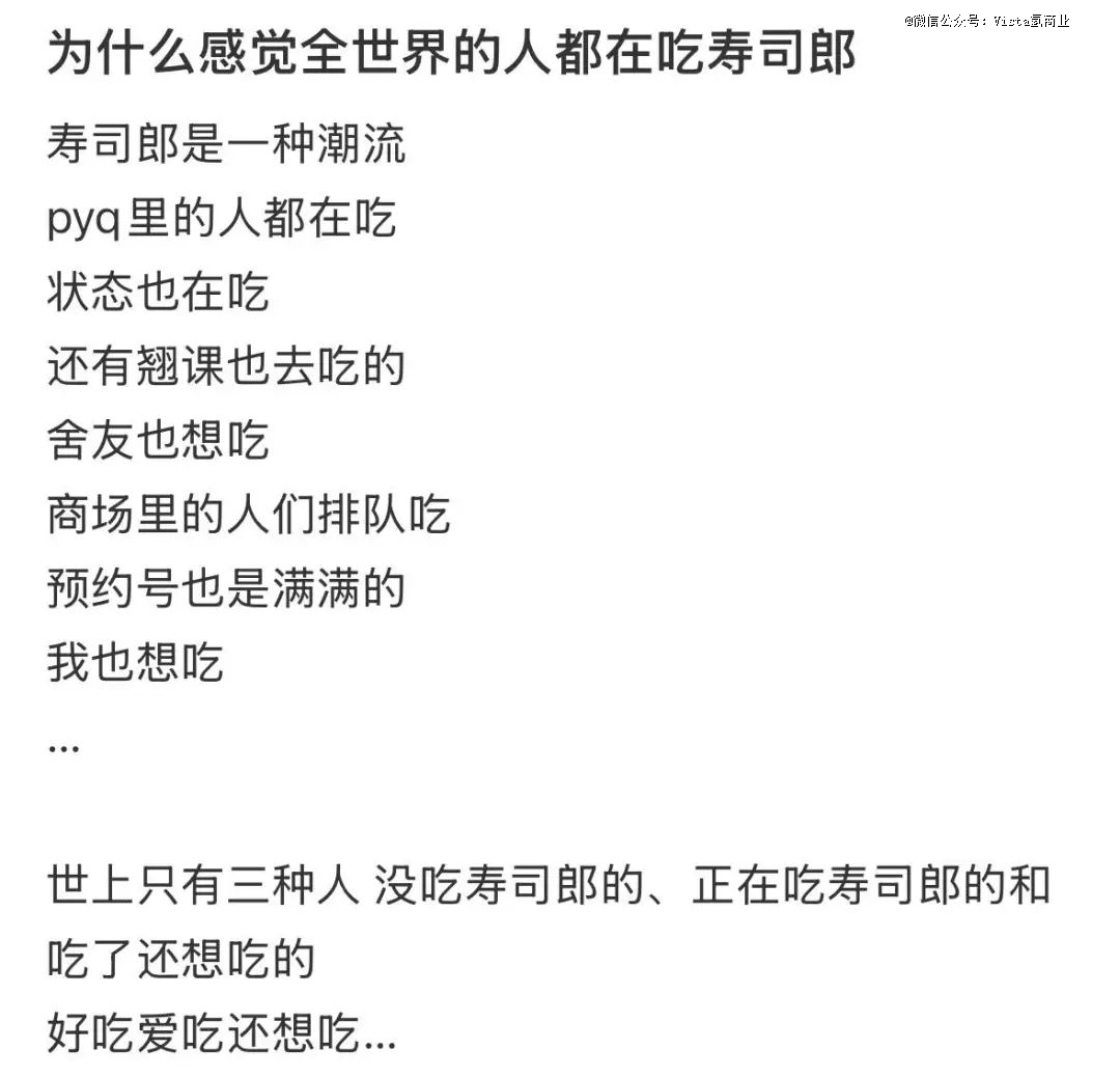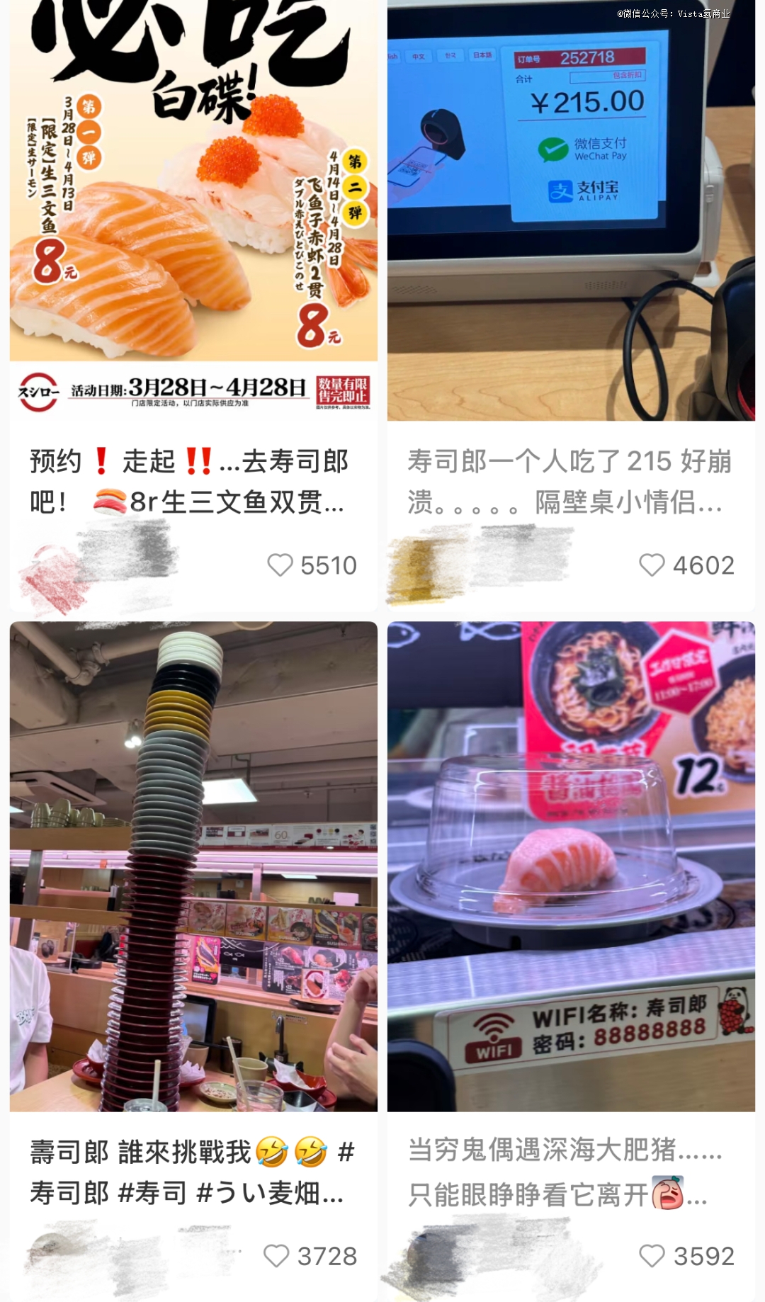 结果最近火了一家回转寿司,8块钱的肥美三文鱼寿司无限吃,还被网友开发出“0元购”“花小钱办大事”等经典穷鬼吃法,因此被叫做【寿司萨莉亚】。