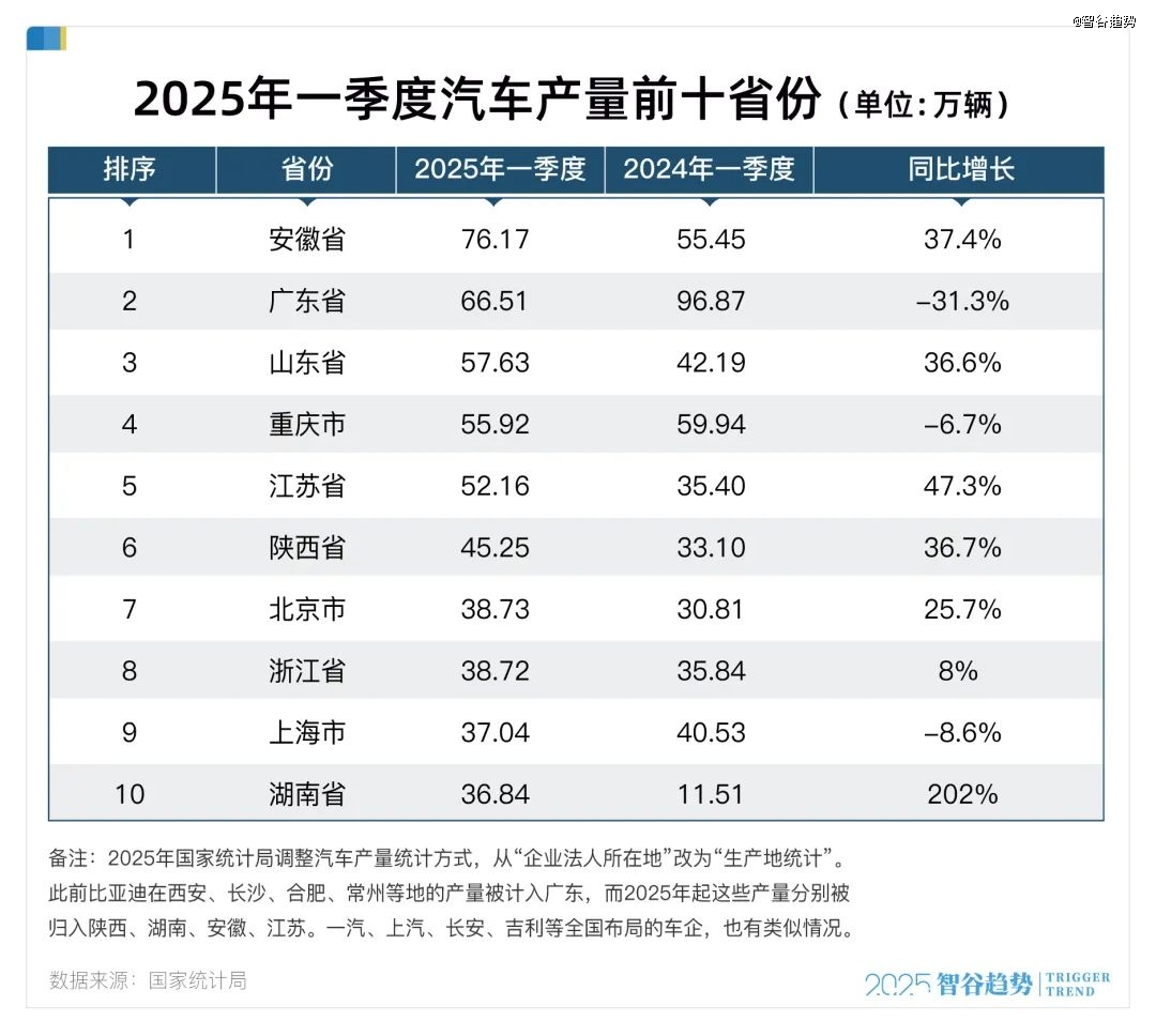 其直接原因,是2025年国家统计局调整汽车产量统计方式,从“企业法人所在地”改为“生产地统计”。比如,此前比亚迪在西安、长沙、合肥、常州等地的产量被计入广东,而2025年起这些产量则分别被计入陕西、湖南、安徽、江苏,造成一次“数据大洗牌”。