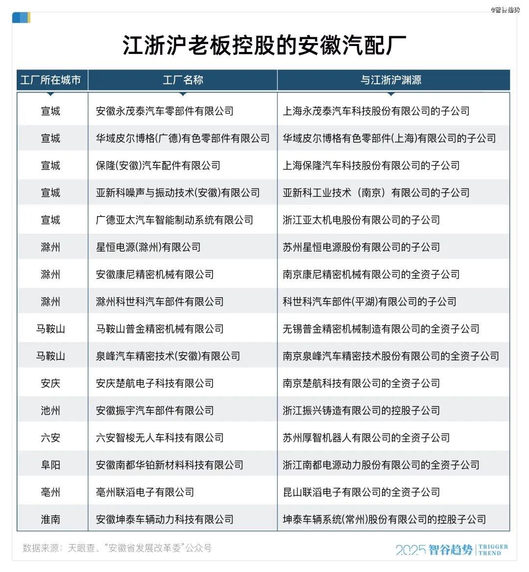 宣城是安徽汽车产业第三城,当地前十大汽配厂有五家是江浙沪企业的子公司。滁州、马鞍山、池州、安庆、六安,淮南、亳州、阜阳等地,也有江浙沪老板开办的汽配厂。
