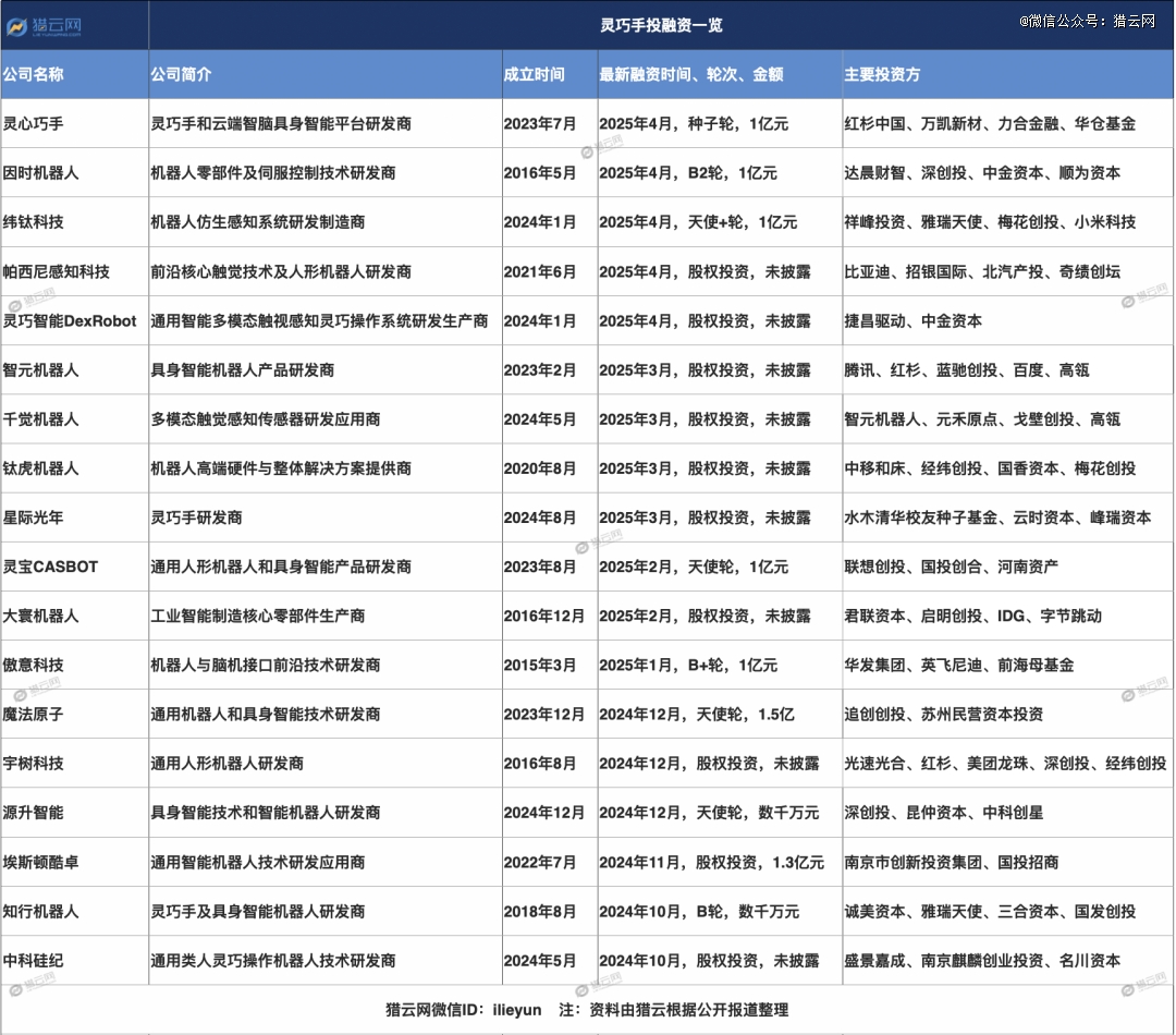 据猎云网不完全统计,自2024年以来,国内灵巧手相关融资案例共有20起,最新一轮融资,合计金额达10亿量级: