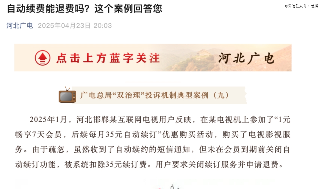 2025年1月,河北邯郸某互联网电视用户反映,在某电视机上参加了 “ 1元畅享7天会员,后续每月35元自动续订 ” 优惠购买活动,购买了电视影视服务。