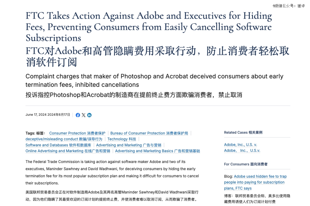 去年六月,Adobe 就被美国联邦贸易委员会指控,说这公司在用户不知情的情况下给用户注册默认的套餐,却没有清晰披露相关的重要条款。