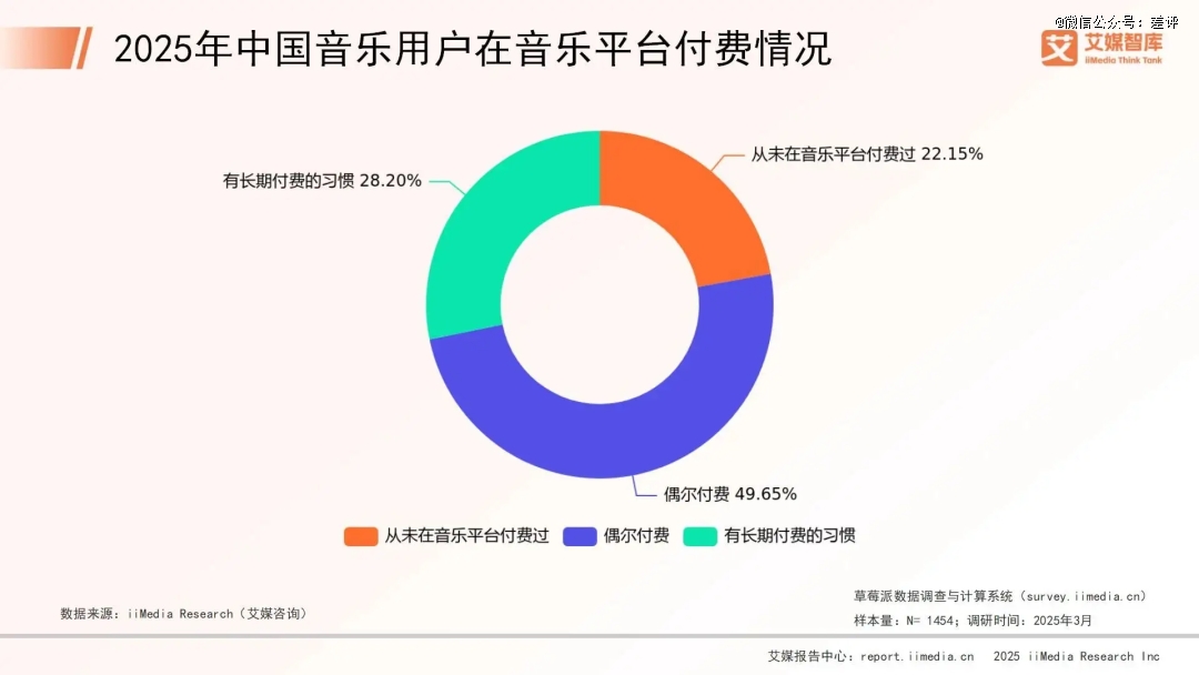 就拿大家用来听歌的音乐软件来说,艾媒咨询《2025 年中国音乐行业市场消费行为调查数据》,49.65% 用户选择 “偶尔付费”,28.20% 的用户 “有长期付费的习惯”,仅有 22.15% 的用户 “ 从未在音乐平台付费过 ”。