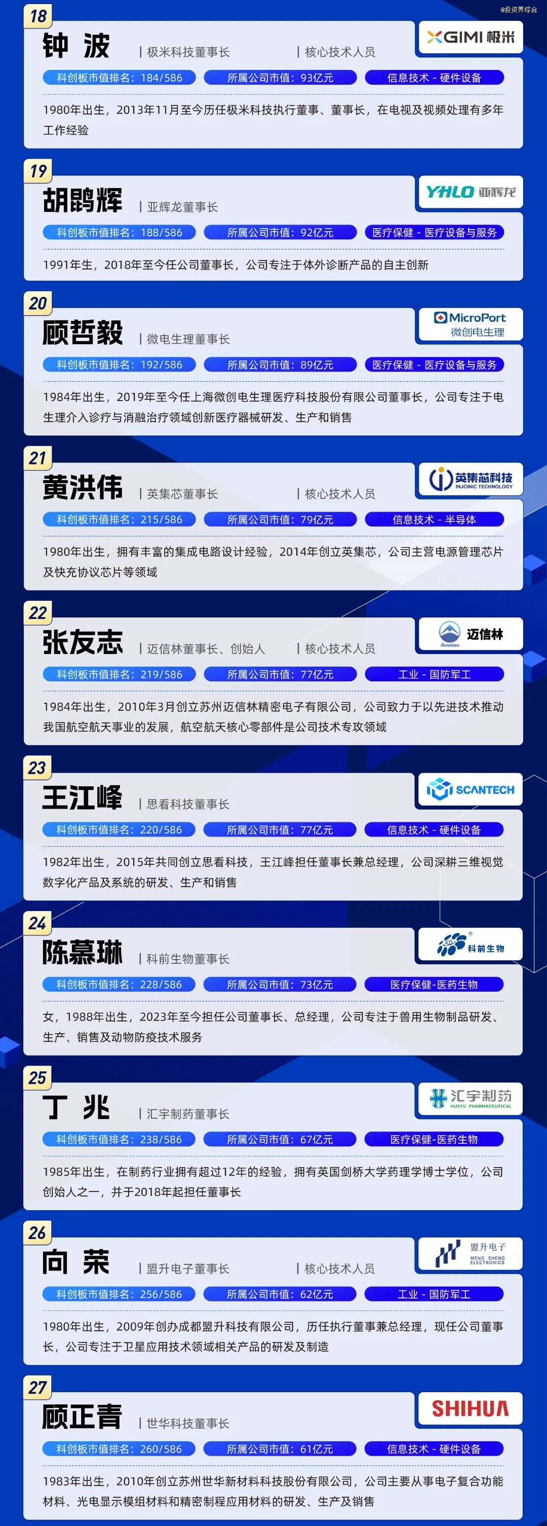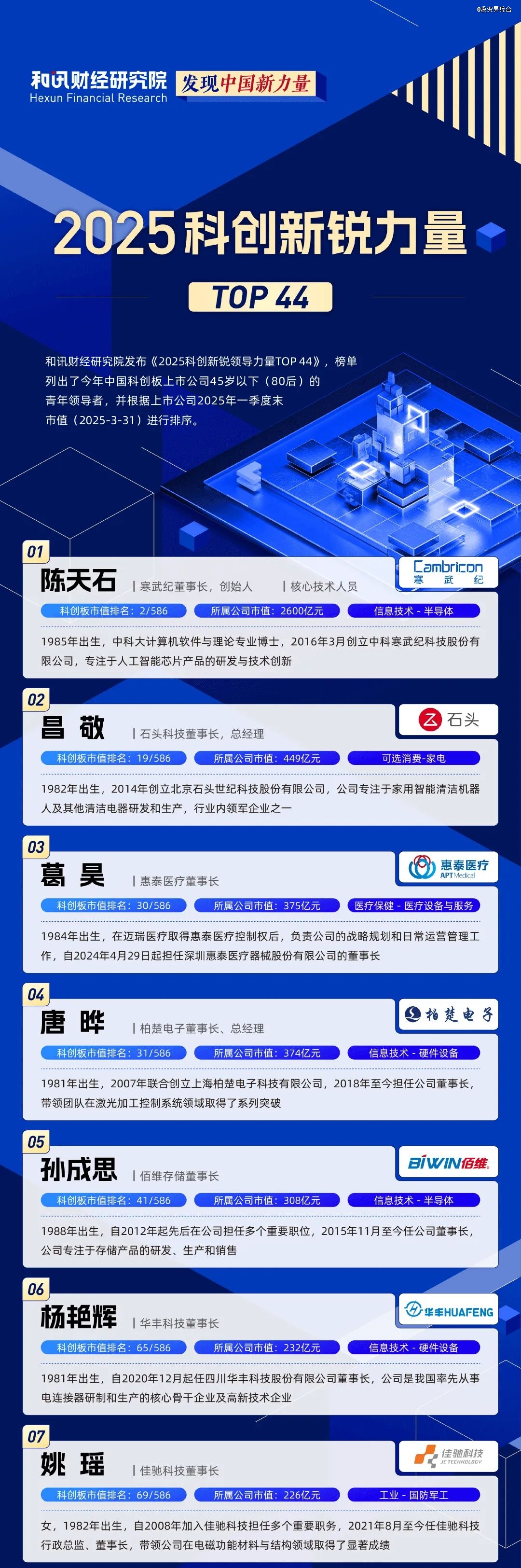 和讯财经研究院发布《2025年中国科创新锐力量榜》,榜单列出了今年中国科创板上市公司45岁以下(80后)的青年*,并根据上市公司2025年一季度末市值(2025-3-21)进行排序。