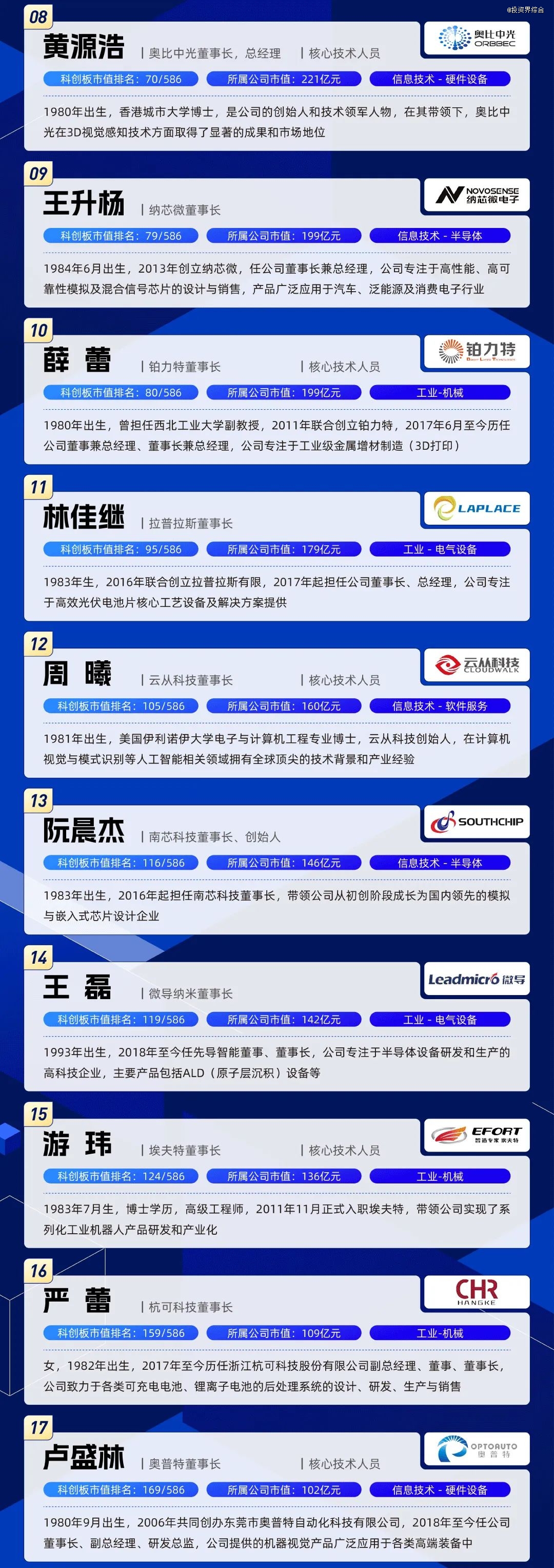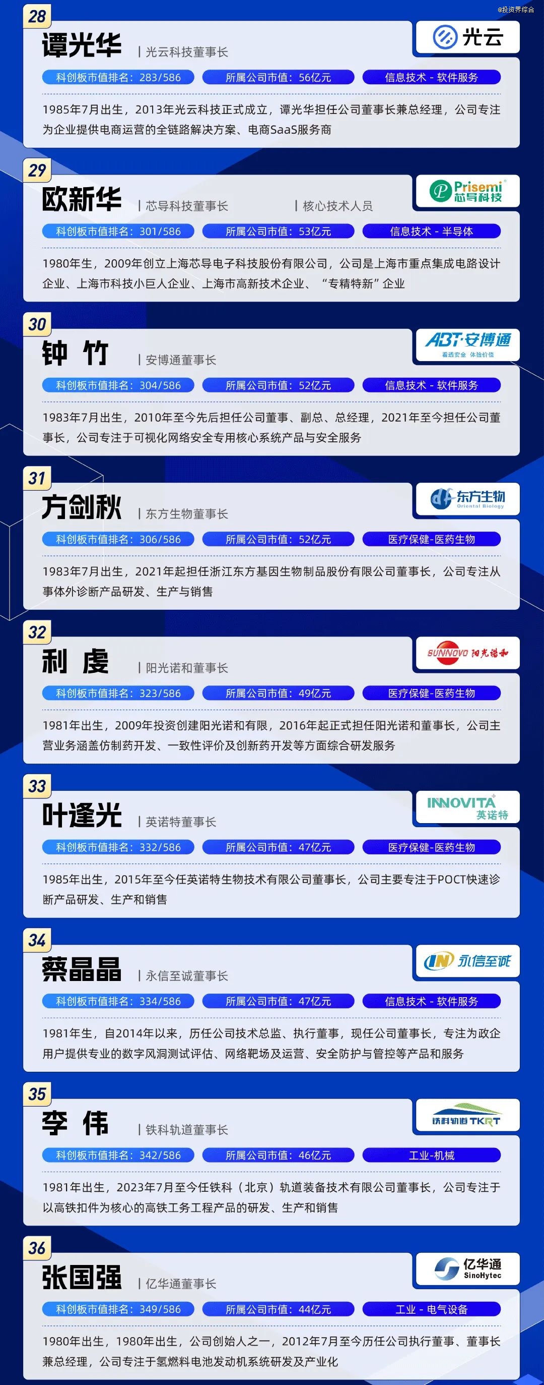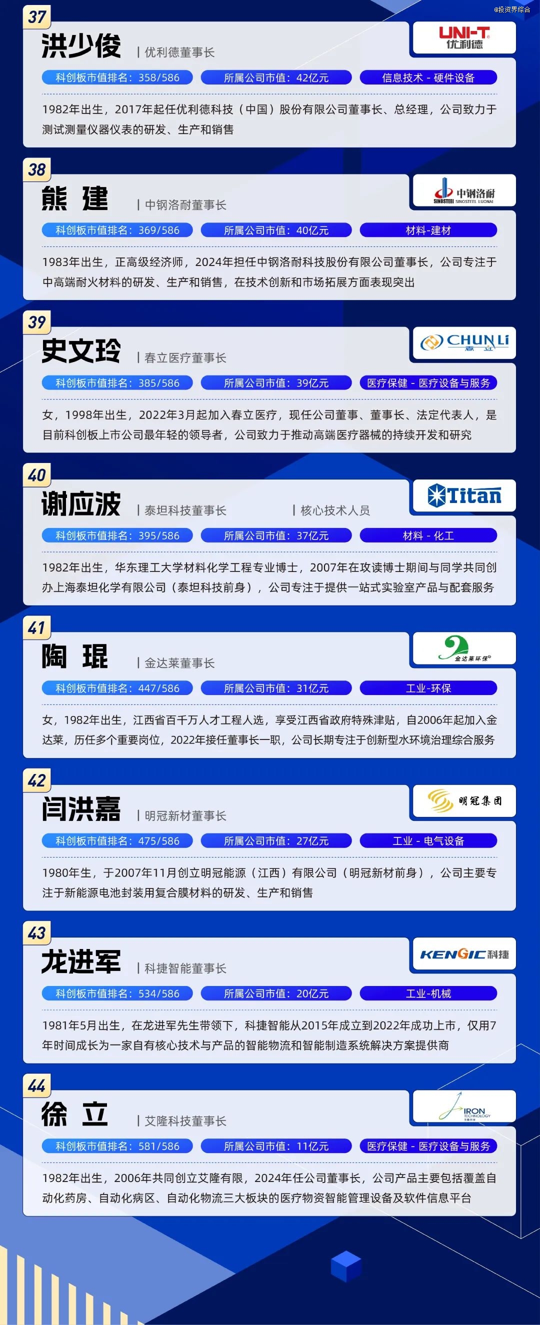 科创板作为资本市场改革的重要平台,也是中国科技创新企业的集中地,和讯财经研究院通过对586家科创板上市公司的深入分析,基于多维数据整合、系统综合分析,筛选出44位科创新锐*,不仅是对他们*领导力的认可,也彰显了中国科技创新生态中,中青年*在推动产业升级和经济高质量发展中的核心作用,希望以此鼓励更多青年人投身到科技创新事业中,共同推动国家未来的科技腾飞与产业突破。