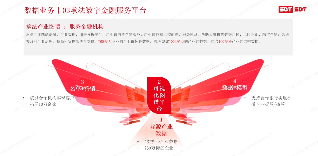 承法产业图谱是深度数科集团在数据服务领域的核心产品,是融合产业数据、图谱分析平台、产业链服务、产业链数据风控的综合服务体系。这一创新成果的诞生,源于深度数科对产业深度数科通过分析海量业务数据,,为金融机构提供数据增信服务。不仅如此,承法产业图谱为金融机构提供增白扩库、精准营销服务。
