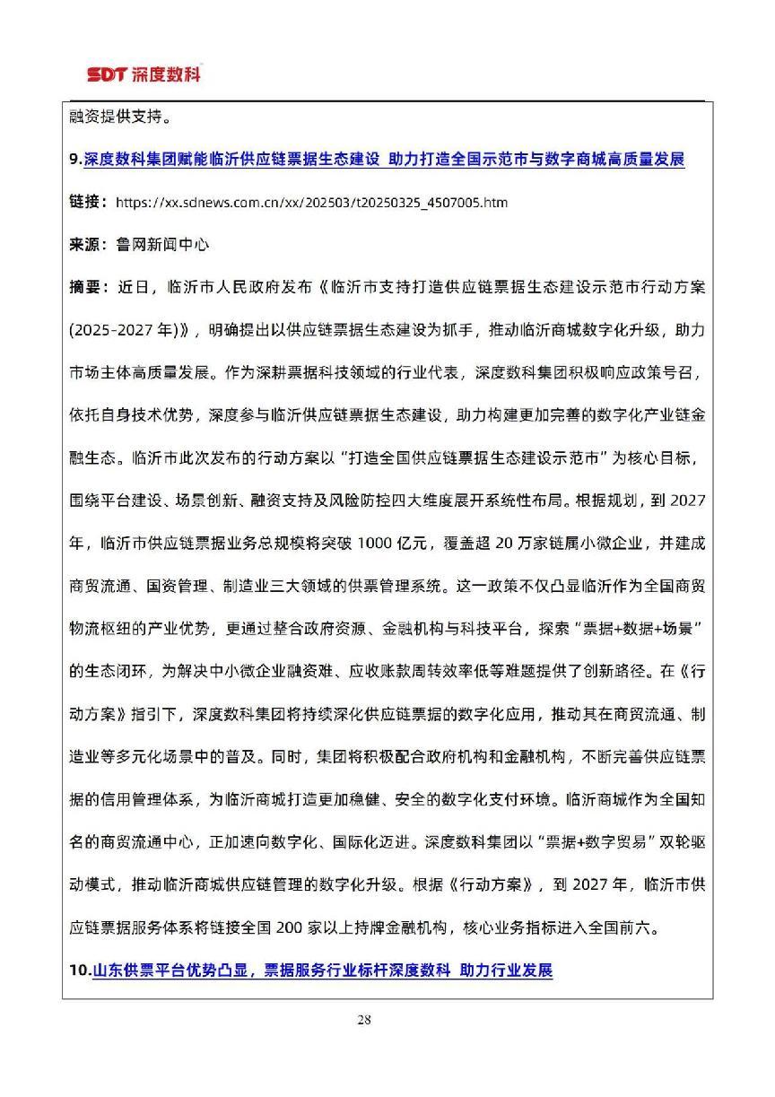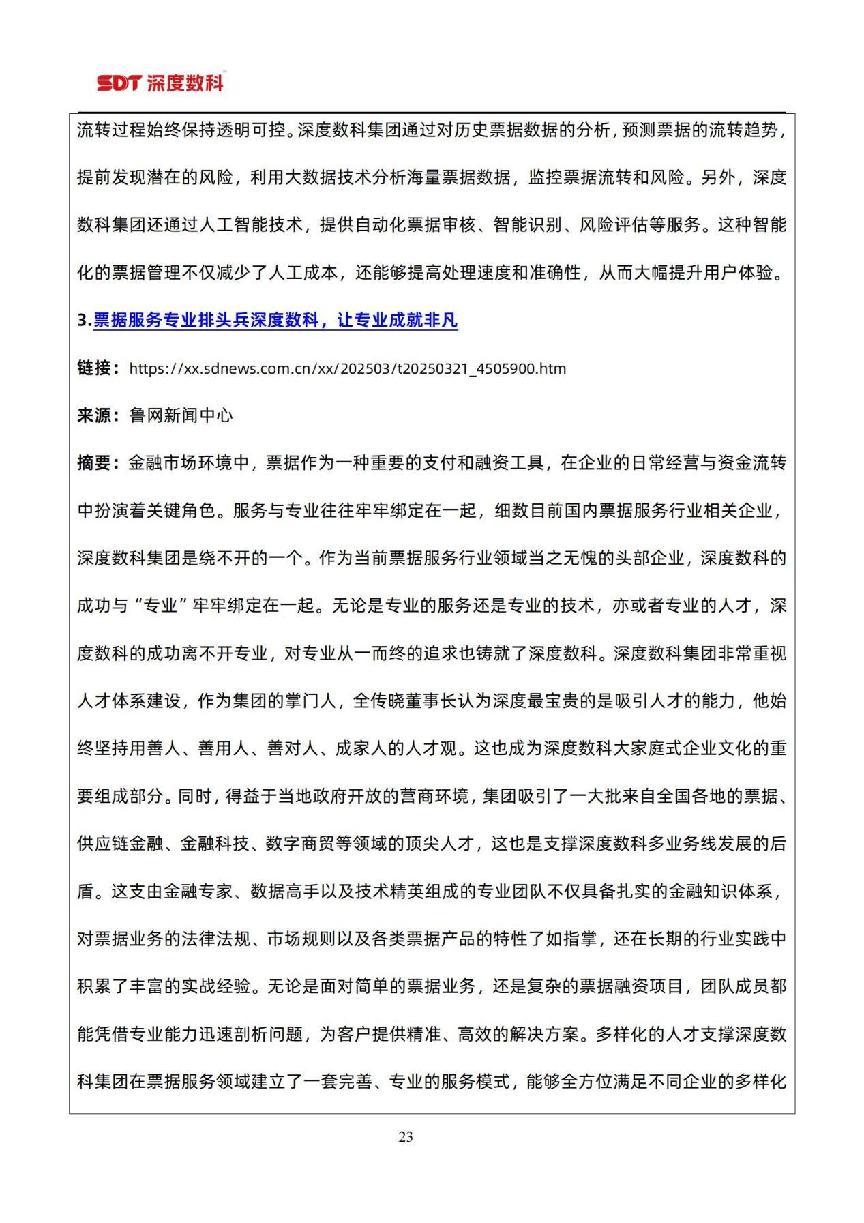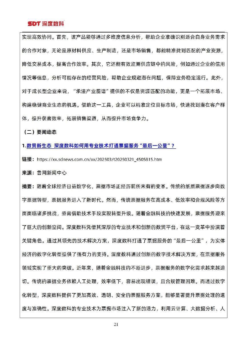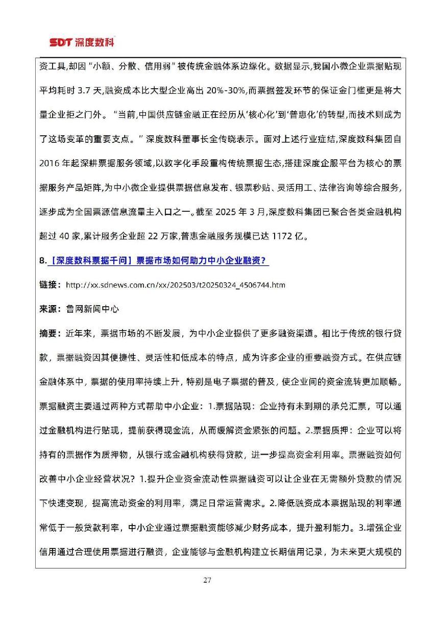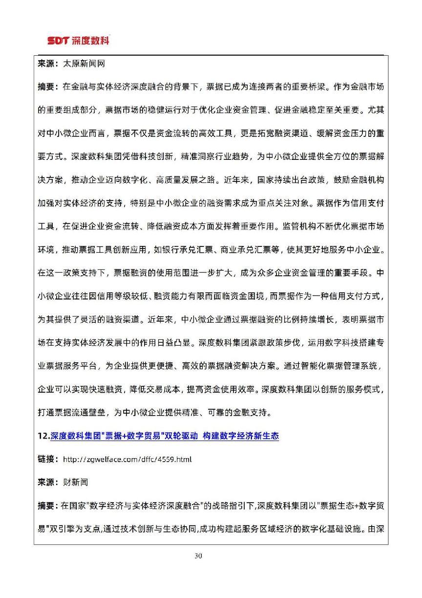 在票据市场信息方面,以目前国内票据服务行业代表性企业深度数科集团为例,为了更好服务中小微企业,深度数科集团旗下企业服务平台、承贝供应链金融服务平台、承法产业图谱等平台正以深厚的科技底蕴和场景服务能力,持续为行业高质量发展提供案例参考,并注入强劲动力。