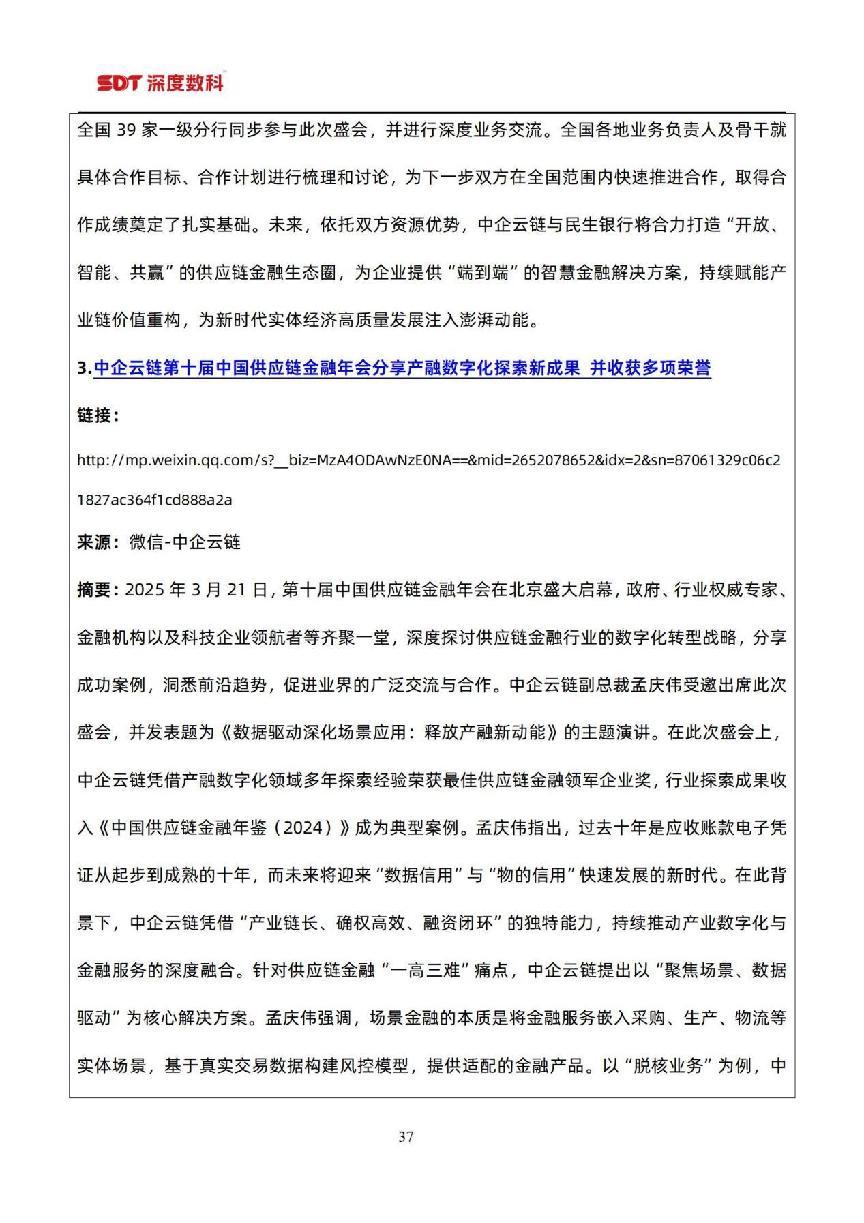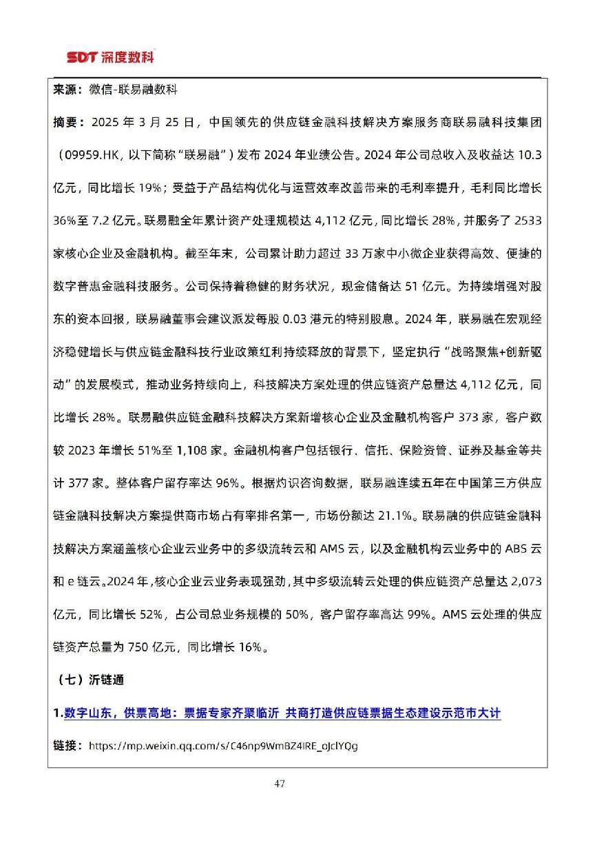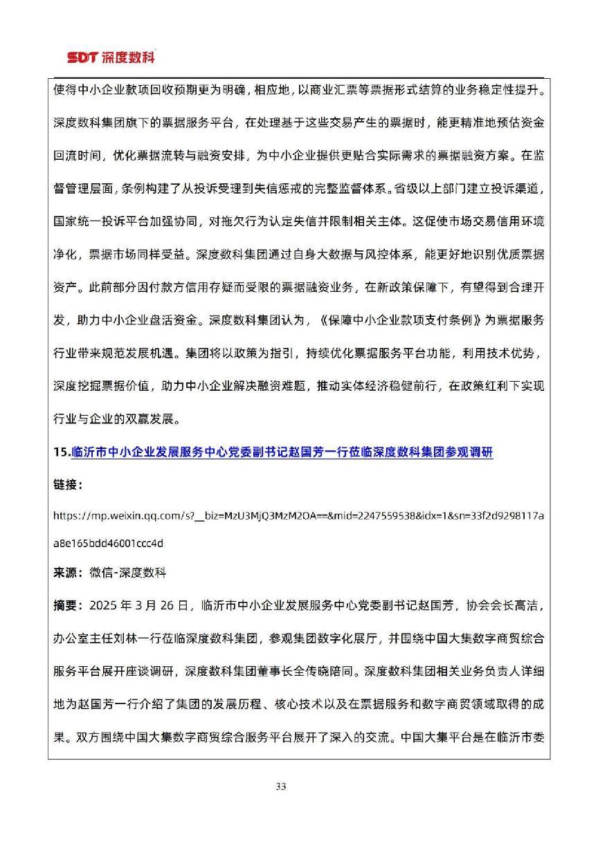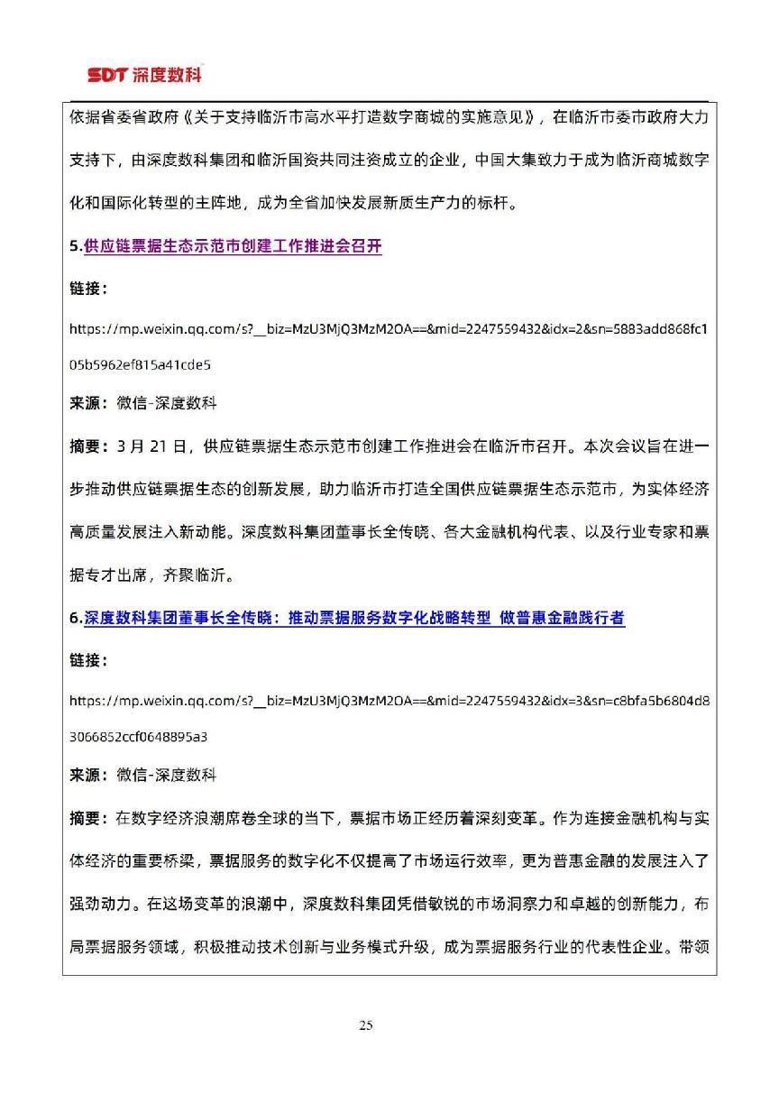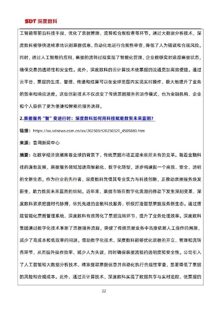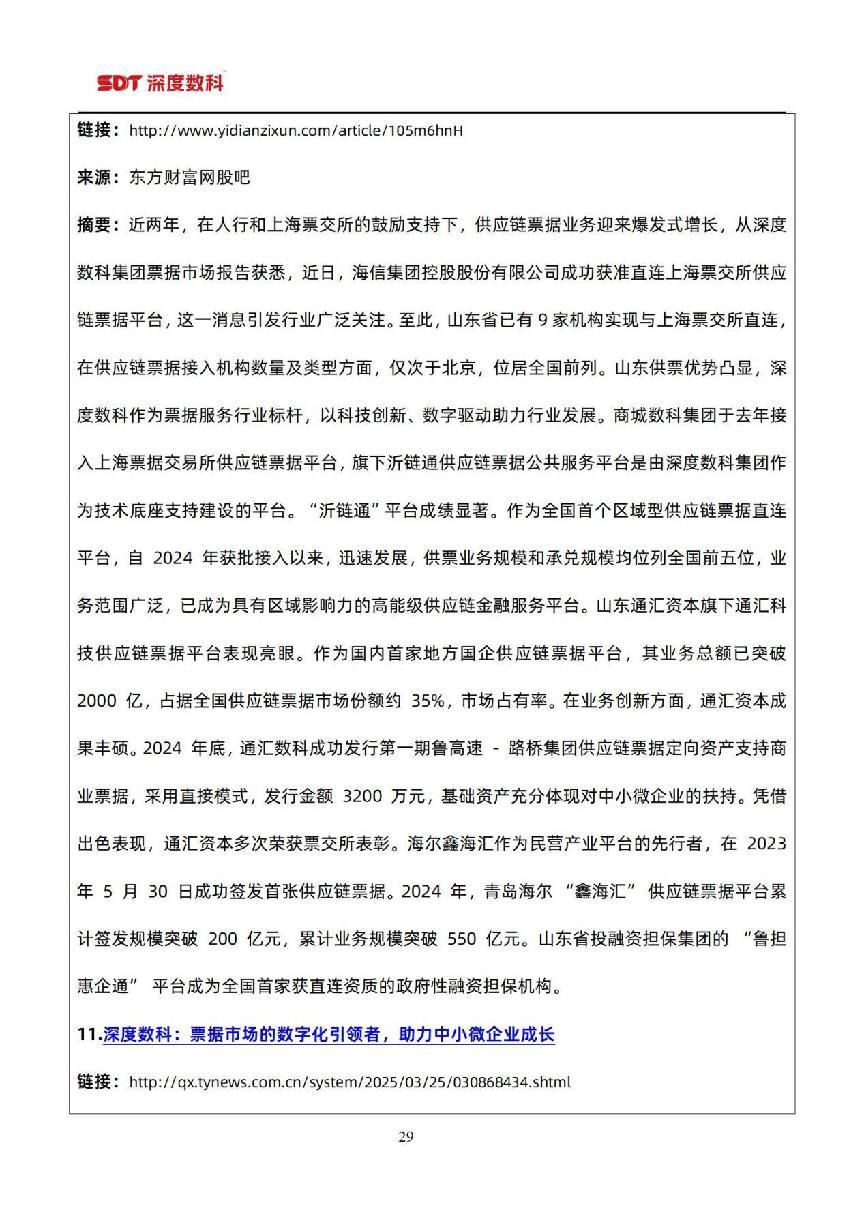 在票据市场信息方面,以目前国内票据服务行业代表性企业深度数科集团为例,为了更好服务中小微企业,深度数科集团旗下企业服务平台、承贝供应链金融服务平台、承法产业图谱等平台正以深厚的科技底蕴和场景服务能力,持续为行业高质量发展提供案例参考,并注入强劲动力。