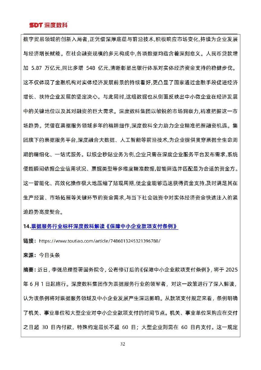 另外,票据主管机构以及同行业的伙伴们所发布的关于票据的研究报告也非常值得我们关注:上海票据交易所发布的《票据市场分析报告》,该报告提供中国票据市场的交易数据、市场分析以及政策解读;中国银行业协会发布的《中国票据市场季度报告》,该报告提供中国票据市场的季度统计数据和分析;证券时报网发布的《中国票据市场2024年回顾与2025年展望》,作者系江西财经大学九银票据研究院 肖小和、李紫薇。在此,衷心感谢票据主管机构以及专家、同行业伙伴们所做出的卓 越贡献,我们期望深度数科的票据报告能够与行业内的其他票据报告共同发力,提升票据市场信息的透明度,同时也能为监管机构以及票据市场参与者提供宝贵的数据支持和决策依据。深度数科始终心怀感恩,期待与伙伴们一路同行、携手共进,为票据市场的推广和繁荣贡献力量。