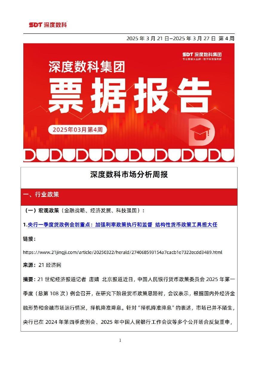 票据报告是票据市场参与者了解市场、洞察行业的重要窗口,为更好地服务票据市场、服务用户和合作伙伴,深度数科发挥票据服务行业代表示范作用,定期发布票据报告,并于今日发布《3月第4周票据报告》。深度数科票据报告坚持周更,为票据市场生态建设成员提供宏观到微观的政策解读、市场态势、前景展望及风险预警等全方位剖析,构筑深度透视市场的智慧视窗。