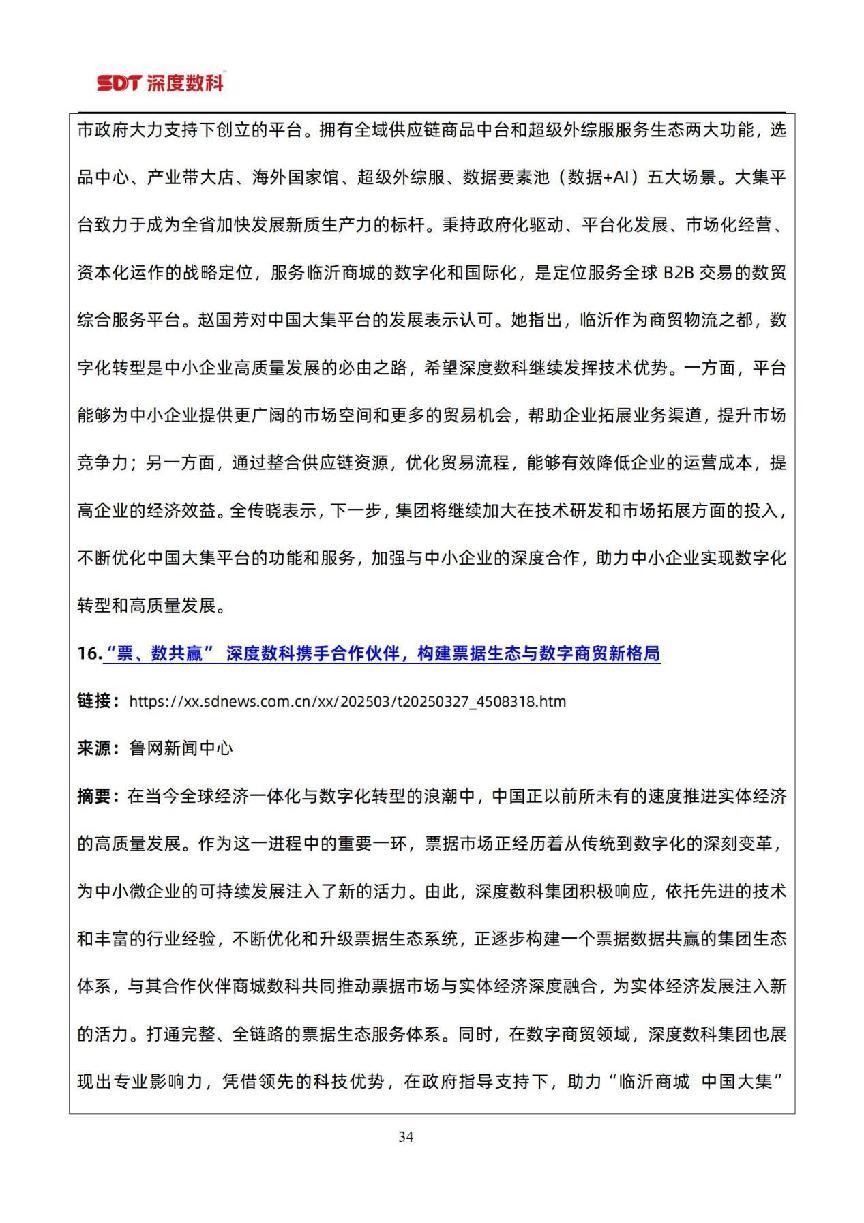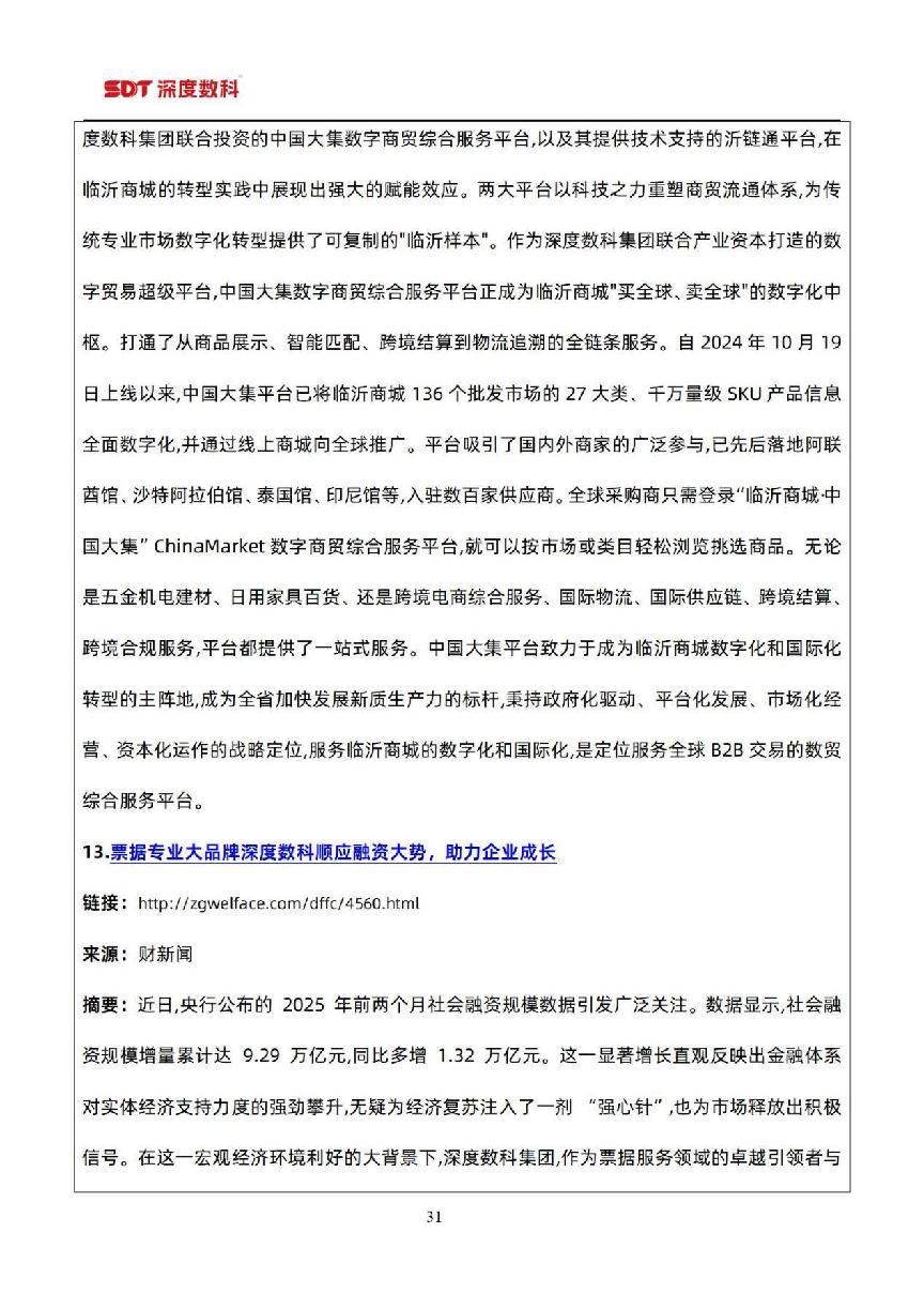 深度数科集团自2016年创立,迅速崛起为票据服务数字化领域的领军者。秉持“让票据助力企业深发展”的使命,怀揣 “服务百万级中小微企业”的愿景,构建起票据与数据双引擎驱动业务发展。目前,集团围绕票据和数据两大业务主线,已成长为全国*票据流量入口之一,为超23万家企业服务,还聚合40余家金融机构资源,累计提供超千亿规模普惠金融支持。作为临沂市政府指定的数字化转型服务商,集团与国有平台共同打造 “中国大集数字商贸综合服务平台”,重塑万亿级商贸物流场景,推动商户交易效率大幅提升,实现供需精准匹配,降低交易成本。未来,深度数科将持续深耕数字化创新,拓展业务边界,挖掘更多数字化服务场景,全力成为中小微企业增长的强劲加速器,助力企业在数字经济浪潮中稳健前行、蓬勃发展。