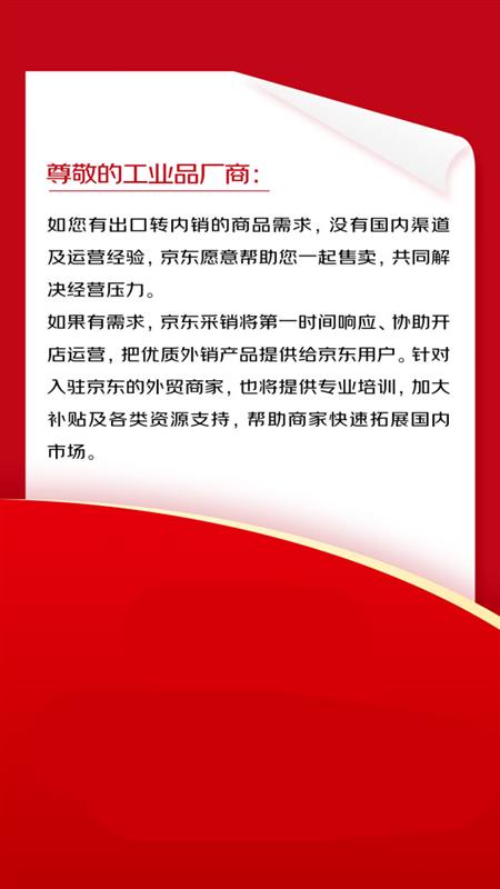 京东工业相关负责人表示,希望通过“出口转内销”扶持计划,助力广大工业品外贸企业拓展国内市场,通过专业可信赖的服务,为中国工业品行业不断开拓增长通道。欢迎工业品外贸企业通过专线邮箱org.jdipopzs1@jd.com联系京东专业采销,京东五金城将快速对接,提供办理入驻服务和专业支持。