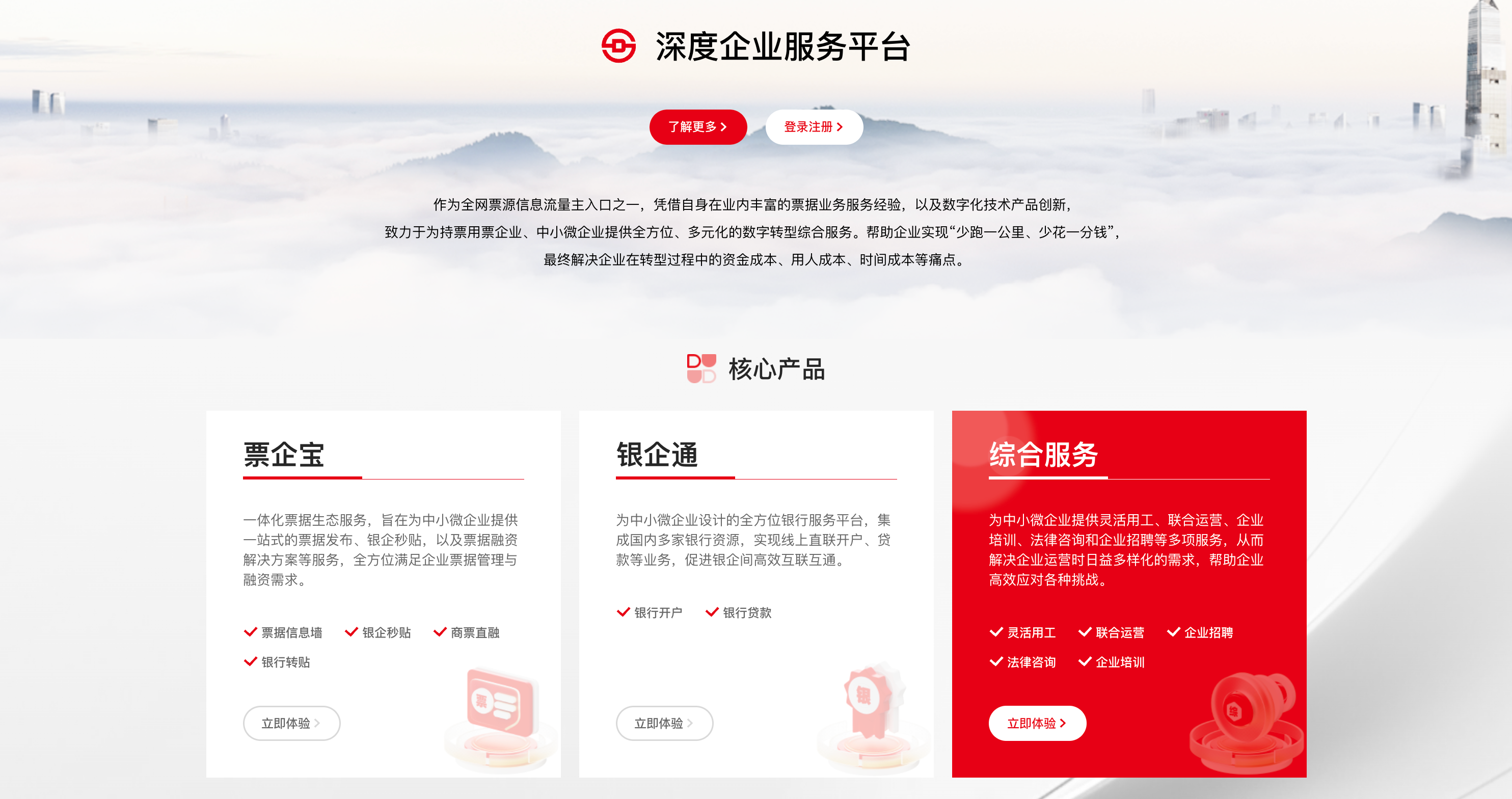 在当前经济环境不断演变、技术不断革新的时代背景下,中小微企业作为经济发展的“活力细胞”,在推动就业、促进创新和维持市场稳定方面发挥着重要作用。然而,这些企业在快速发展的过程中,常常面临资金紧张、人才短缺和管理效率低下等诸多现实问题。与此同时,数字化转型浪潮为企业提供了全新的机遇,促使企业不断寻求更高效、更智能的运营管理方式。深度数科集团始终秉承“服务百万级中小微企业”的愿景,凭借在票据服务与金融科技领域的多年积累,倾力打造深度数科企业服务平台。该平台以“少跑一公里、少花一分钱”为服务理念,通过整合票企宝、银企通和综合服务等核心产品,构建起一站式企业服务生态,为中小微企业提供涵盖法律、用工、培训、招聘等多维度支持,助力企业实现数字化转型与高质量发展。