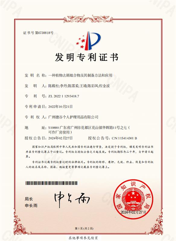 自2010年开辟高端香氛洗护细分赛道以来,阿道夫一路高歌猛进,已累计7年荣登国货洗护水销售份额榜首。这份斐然成绩的背后,创新是阿道夫最为强劲的发展引擎。截至2025年4月,阿道夫已揽获超300项授权专利,发明专利有37项,全方位覆盖产品配方、生产工艺、包装设计等研产流程关键领域。其中阿道夫在全球首创的植物去屑专利——《一种植物去屑组合物及其制备方法和应用》,从天然植物中萃取有效成分,打破传统去屑思维定式,为消费者呈上温和且高效的去屑产品,也为洗护行业提供全新的去屑“旋律”。