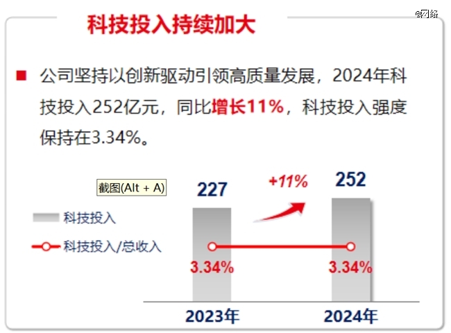 中信集团管理层表示,科技创新是中信的一大特点,也是一大亮点,它已经根植于公司发展的基因和血脉。这些年公司业绩稳定增长,科技创新是现实的动力,同时也是未来的潜力。2024年中信股份科技投入总额为252亿元,科技投入强度达到3.34%,已连续两年超过3%。2024年全年公司荣获国家级、省部级和行业知名科技奖110余项,拥有有效专利9,000余项。