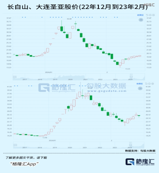 长白山和大连圣亚也多次在冰雪季上演急涨又急跌的过山车式行情。