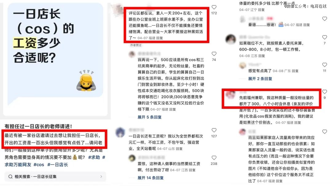 另一方面,即便是带货能力最获业内认可的COS圈,普通COSER去当“一日店长”的报酬也一降再降。在小红书平台上,不少COSER吐槽一日店长的日薪已经被卷到200多元一天,这代表着,扣掉出行成本、COS装备如假发服装消耗等和化妆成本,基本上是“为爱发电”,不仅赚不到钱还要提供长时间的情绪价值。
