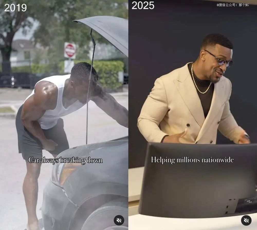 现在,Ashton的视频里经常出现的内容,就是展现曾经失败的自己,炫耀如今的成功。2018年的他开着二手破车,交不上房租;2025年的他开着宾利,住在豪宅里给粉丝上成功学网课。
