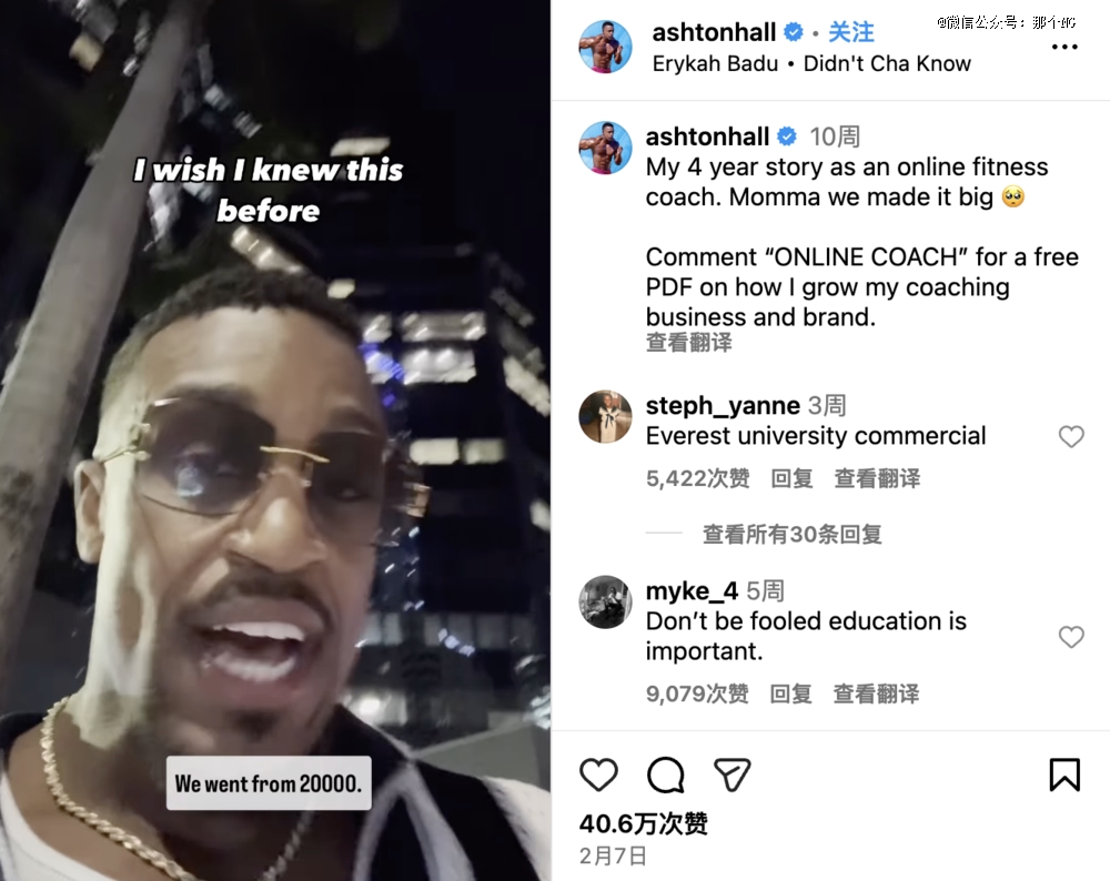 比如Ashton的会员课,内容就是教人如何成为健身网红,然后针对*富人群体拓客,最后成为一名开跑车的网红私教。