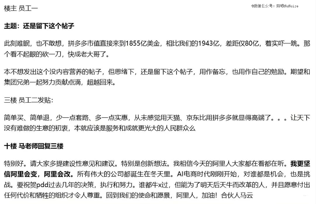 针对这次分拆,有员工曾在社交网络吐槽,称阿里这几年节节败退的原因,是对拼多多等竞对的傲慢,战略的摇摆。身为一线员工他也能感受到组织架构的频繁调整,这让他体会到与过去阿里不同的浮躁。