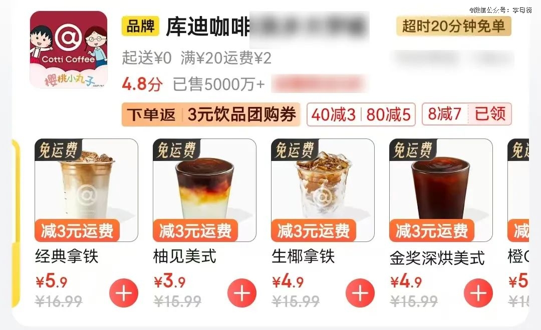 让茶饮门店和大东们单量暴涨的直接原因,是平台的补贴大战便宜到让用户觉得“不买就是亏钱”。 过去10元左右的茶饮,直接被打到了个位数:1.9 元的库迪咖啡、5 元的霸王茶姬伯牙绝弦、5.9元的茉莉奶白。
