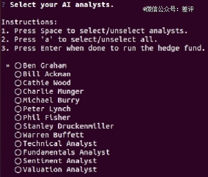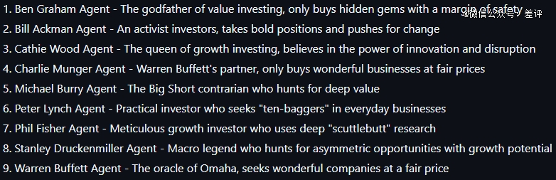AI Hedge Fund 目前一共提供 9 位明星投资人的策略,不仅有各位差友最熟悉的巴菲特,连他的老师 Graham 和 Fisher 都名列其中。