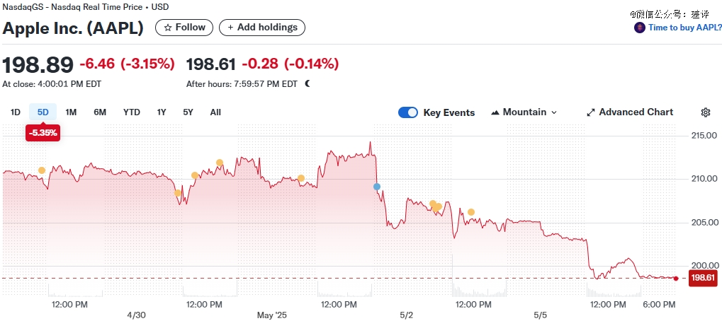 假期五天过去,你还真别说,4 月 30 号苹果最高每股价格 230 刀,到 5 月 5 号只有 198 刀左右了。