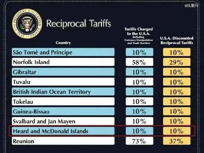 特朗普的这份全球关税名单中,甚至包括南极附近的无人岛群赫德岛与麦克唐纳群岛,只有海豹、企鹅栖息的自然保护区甚至也被纳入征税。