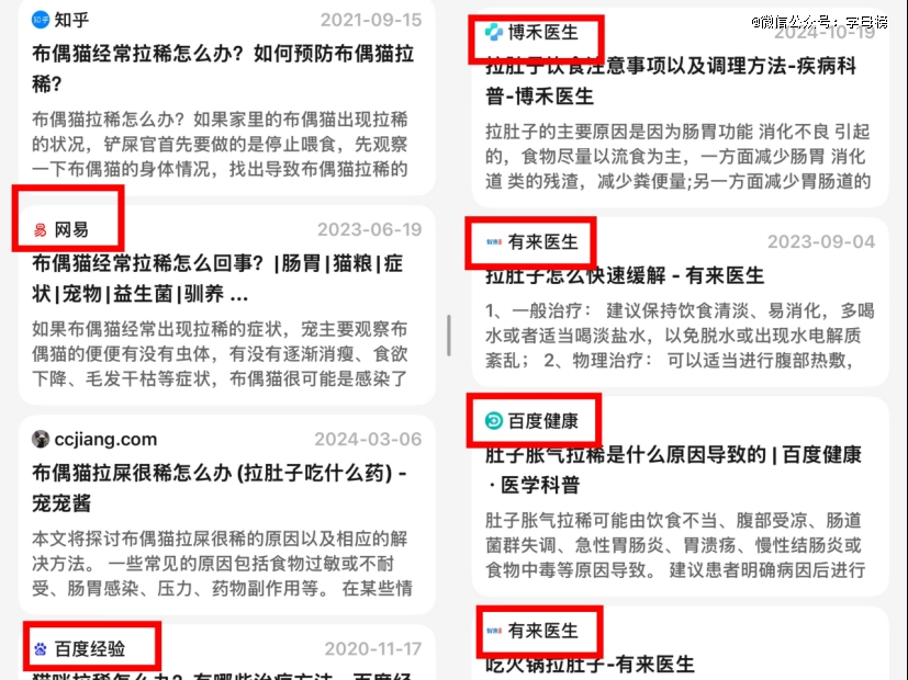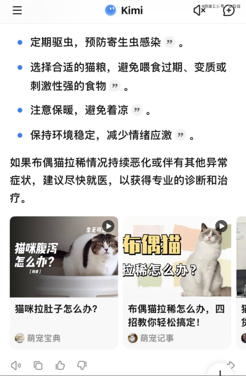 而至于医疗领域,字母榜尝试向Kimi提问,“布偶一直拉稀,怎么办?”尽管Kimi迅速分析了原因和处理方法,但信源并未显示有萌宠相关等国内专业平台或APP,可见在宠物医疗这样更为细分的领域,Kimi的信源储备还有待完善。