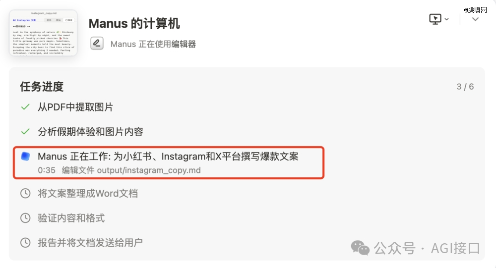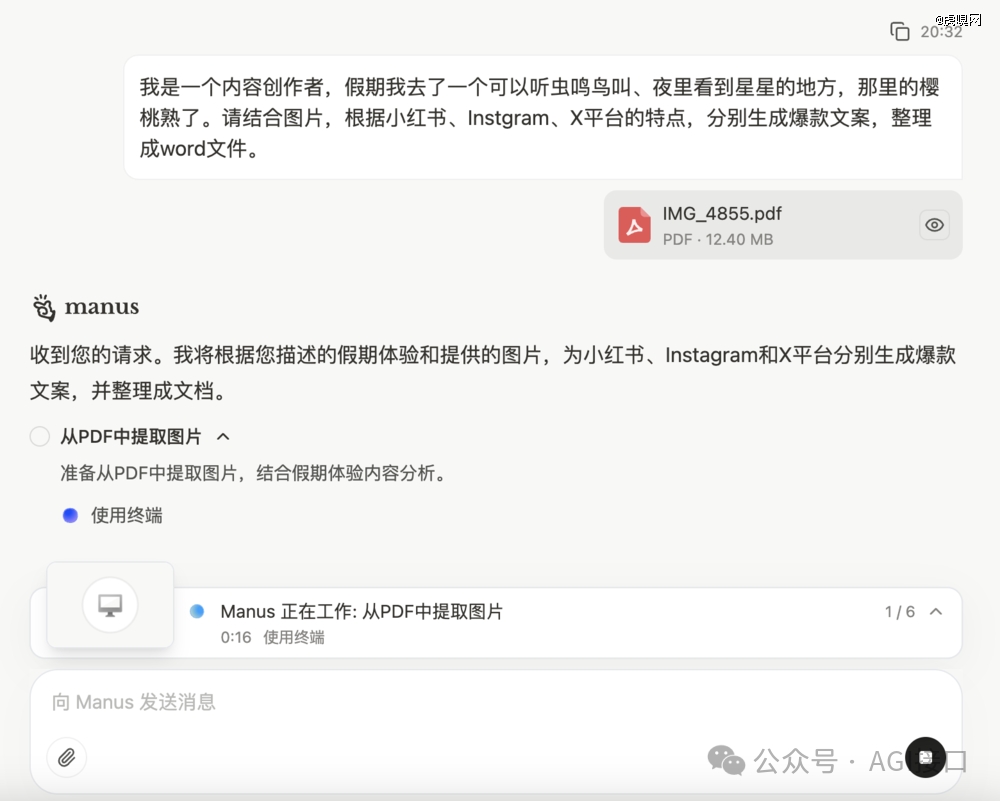 根据官方发布的简历筛选、股票分析、房地产调研演示的经验,预期中Manus将直接交付完整成果。因此,此次测试将上传四张图片附件,再写一段描述文字给Manus,要求它根据小红书、Instgram、X等平台的特点,分别生成爆款文案,整理成一个word给我。