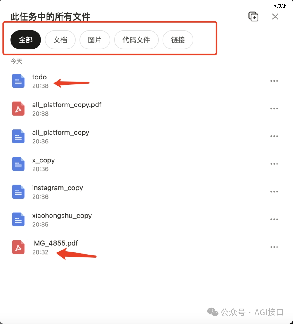 点开可以看到,它分为了文档、图片、代码文件、链接几个大类,并且按照时间顺序倒序排列,可以实现步骤上的溯源。