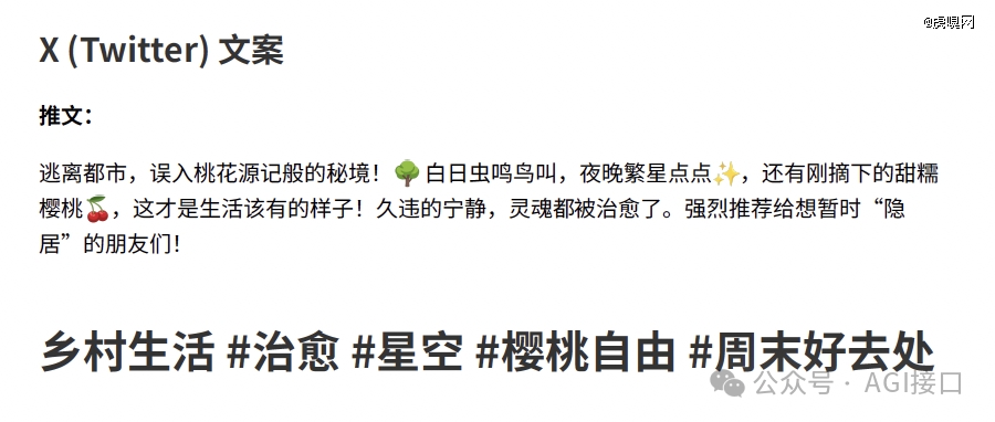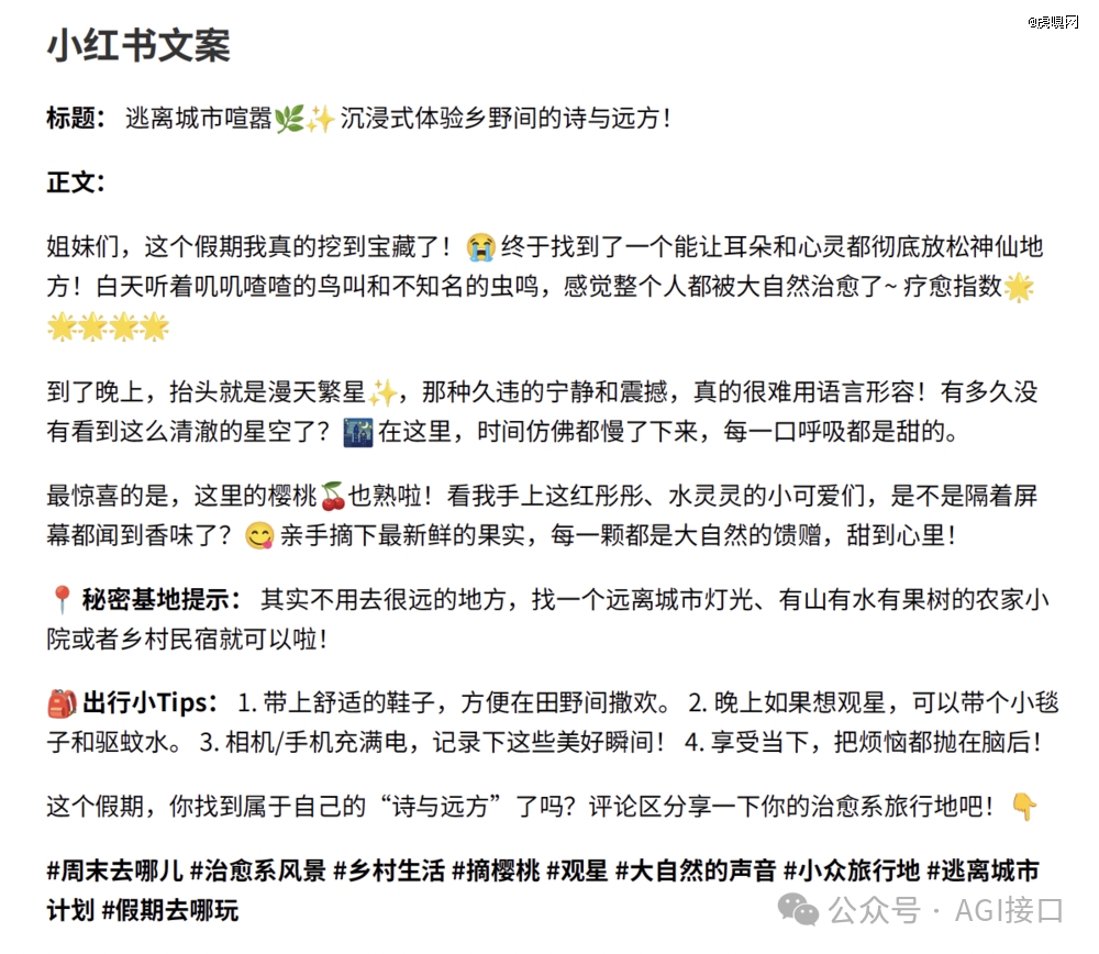 prompt:我是一个内容创作者,假期我去了一个可以听虫鸣鸟叫、夜里看到星星的地方,那里的樱桃熟了。请结合图片,根据小红书、Instgram、X平台的特点,分别生成爆款文案,整理成word文件。