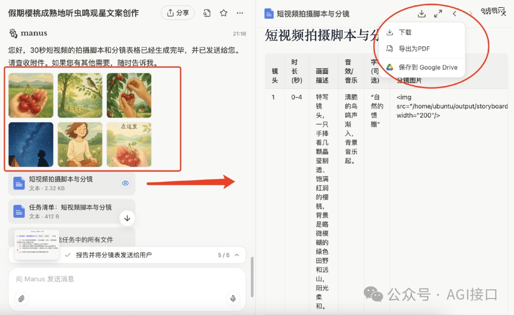 Manus帮我画成了分镜,也提交了表格形式的短视频拍摄脚本和分镜。