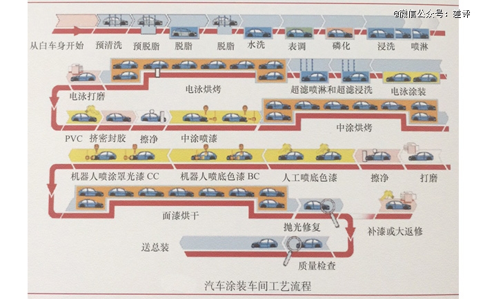 工厂里汽车喷漆主要分为 “前处理——电泳——中涂——面漆” 几个步骤,一步步上漆将车腌制入味。