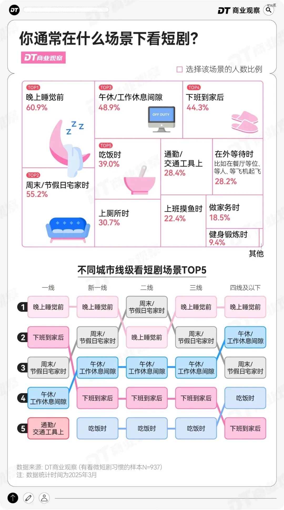 其中,一线城市除了晚上睡觉前看短剧,第二大场景就是“下班到家后”(51%),选择比例高于其他城市。