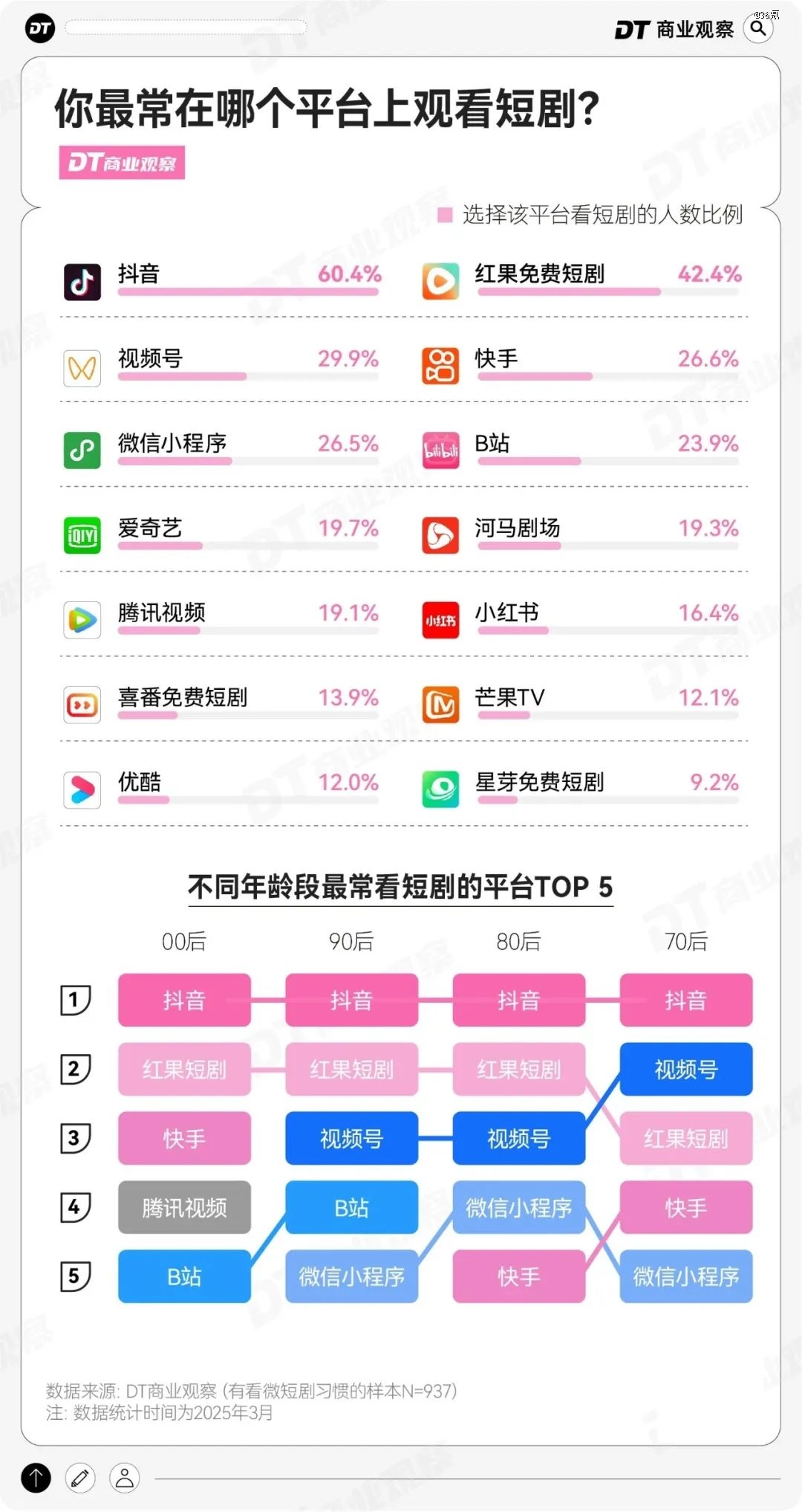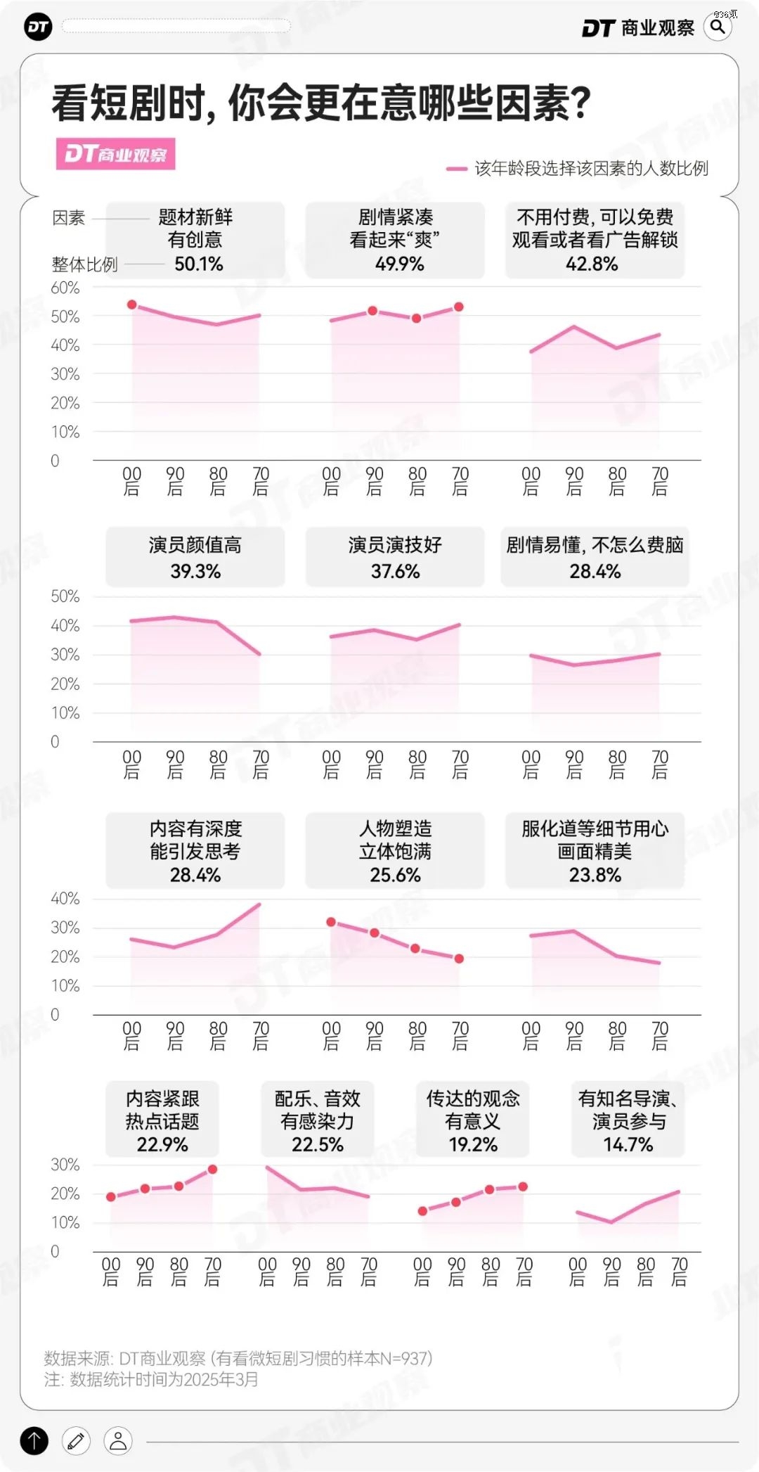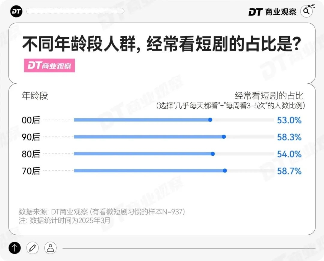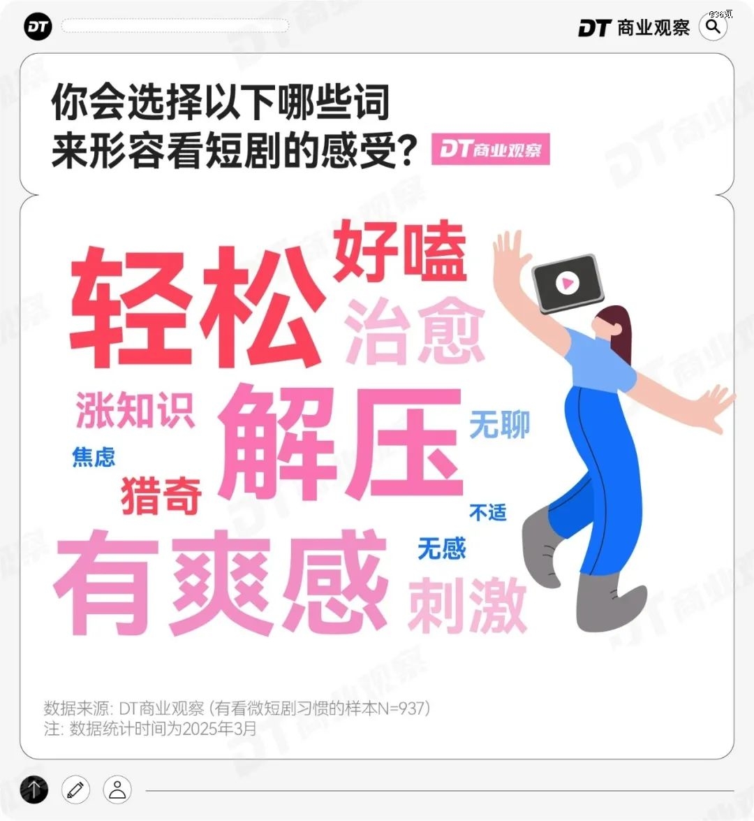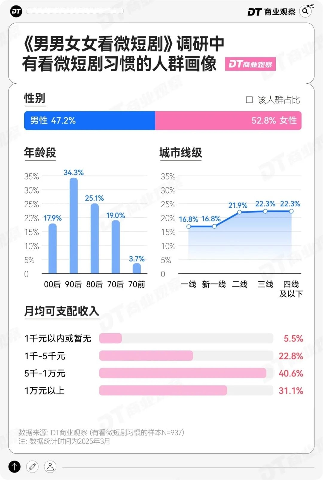 《DT商业观察》联合第 一财经发布了《“当代男男女女看微短剧”小调研》,最终有效样本有1137份,有看短剧习惯的人数为937,几乎不看的人数为200。