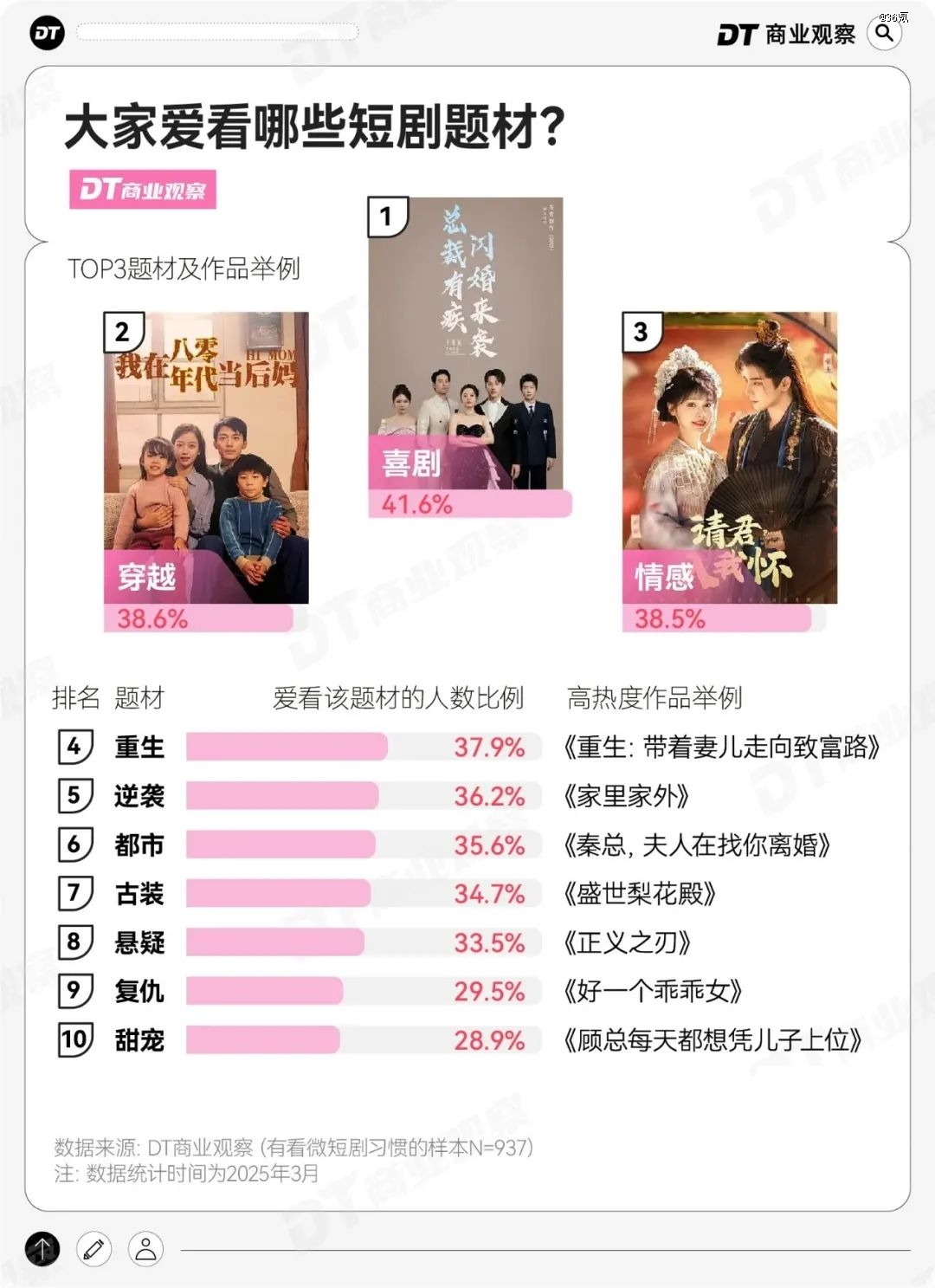 从调研结果来看,喜剧、穿越和情感包揽了最 受 欢 迎的短剧题材前三,然后是重生、逆袭。