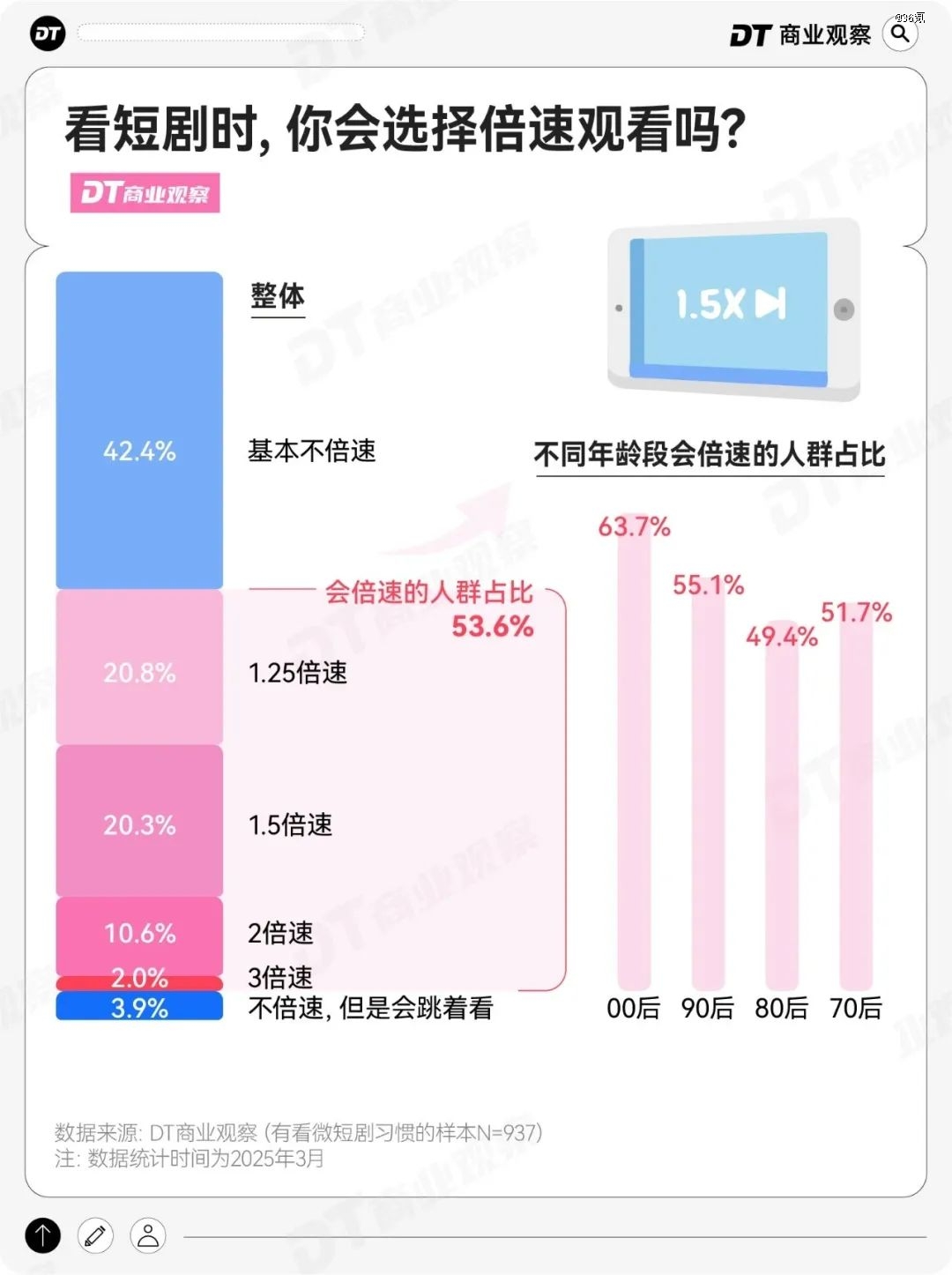从00后到80后,越年轻,选择倍速观看的比例越高,63.7%的00后都会倍速看短剧。