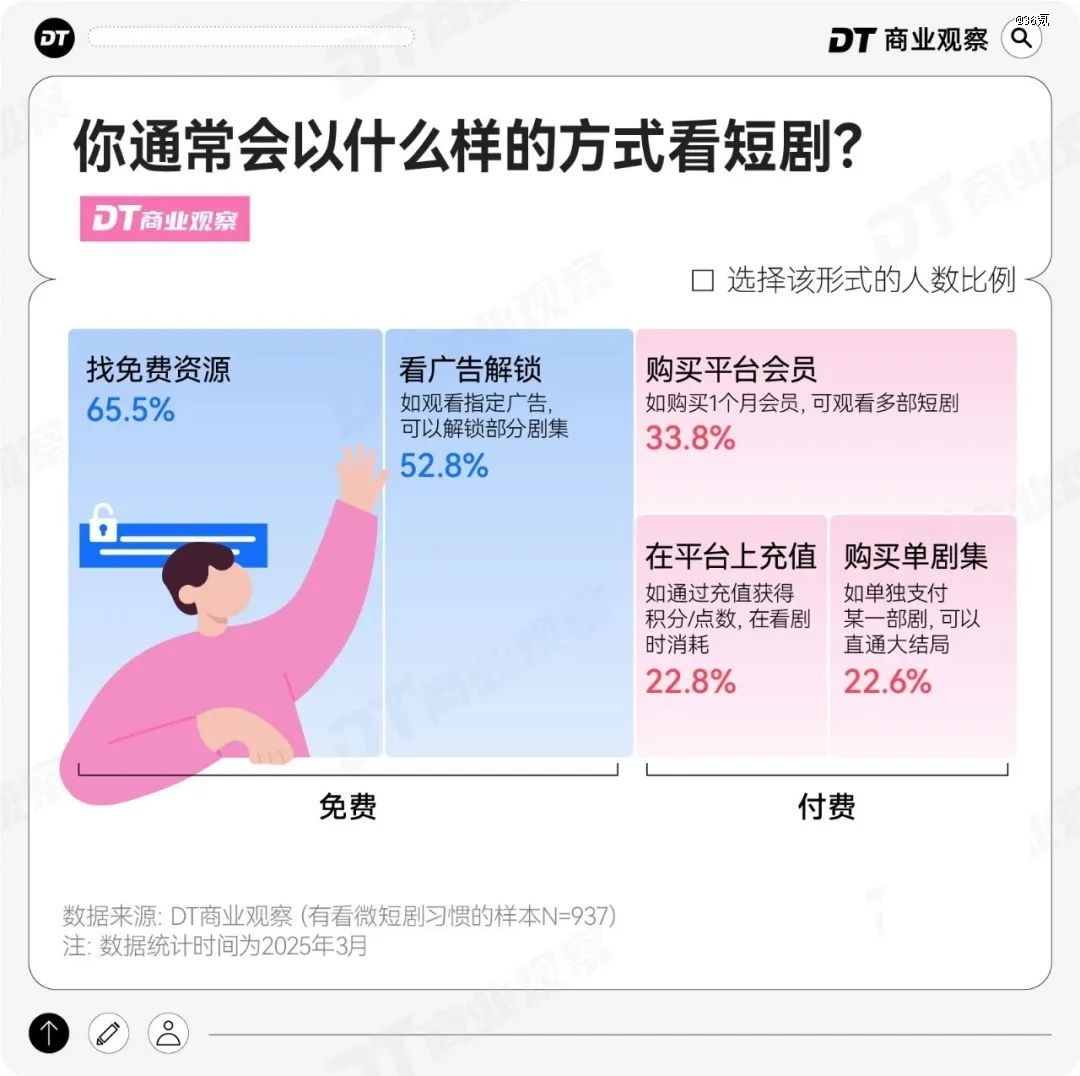 最多人看短剧的方式,首先是找免费资源(65.5%),其次是看广告解锁(52.8%)。