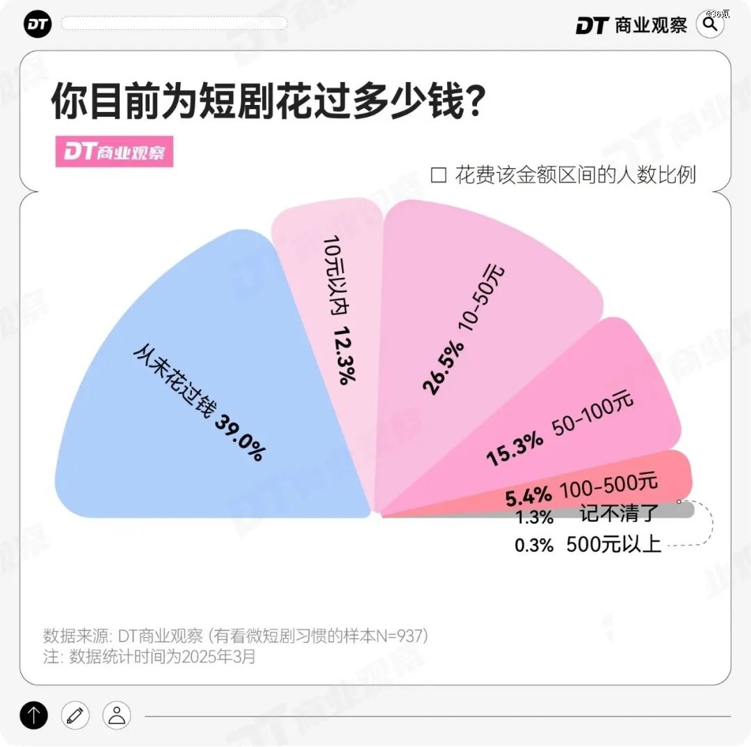 调研中,近6成人给短剧花过钱,但近4成人为短剧花过的钱在50元以内,远远谈不上“疯狂氪金”。