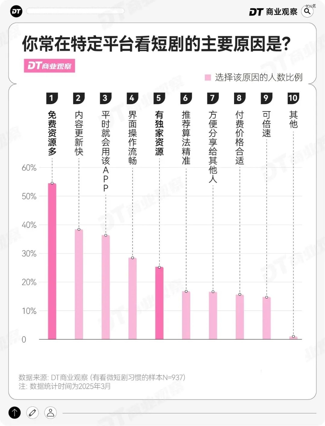 为什么是这些平台呢?倒不是因为“有独 家资源”,而是因为“免费资源多”(54.5%),“内容更新快”(38.4%),以及“平时就会用该APP”(36.4%)。