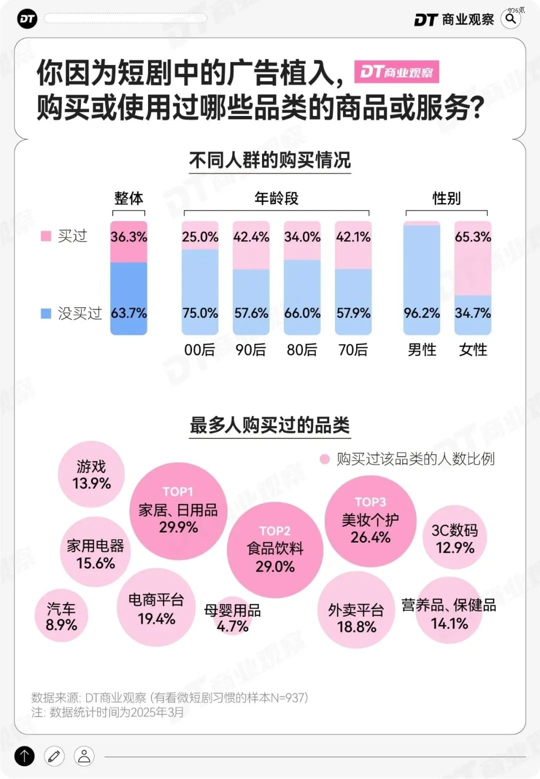 大家因为短剧植入买过最多的品类TOP 3分别是:家居日用品、食品饮料、美妆个护。