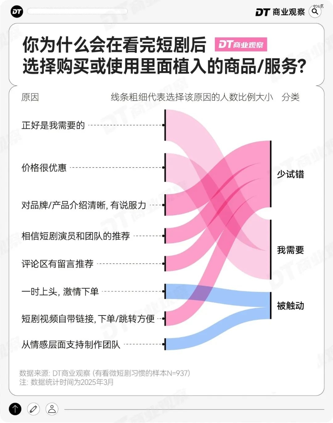 根据调研,大家之所以看完短剧会购买以上品类,首先是因为“正好是我需要的”和“价格很优惠”。