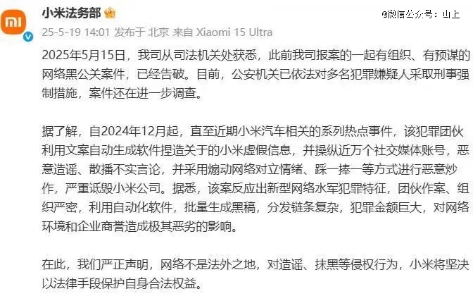 雷军恢复社交媒体更新后不久,小米集团法务部 5 月 19 日对外发布公告,称他们从司法机关处获悉,此前小米报案的一起有组织、有预谋的网络黑公关案件已经告破,多名犯罪嫌疑人已被依法采取刑事强制措施。小米法务部在公告中详细披露了相关“犯罪团伙”的“作案手段”,包括利用文案自动生成软件捏造小米虚假信息、操纵近万个社交媒体账号等等。
